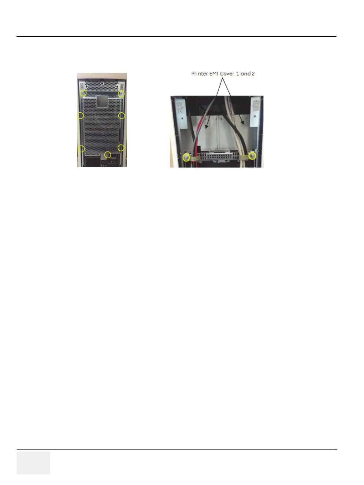 10.)Unscrew 2 screws and disassemble printer EMI cover 1 and 2.