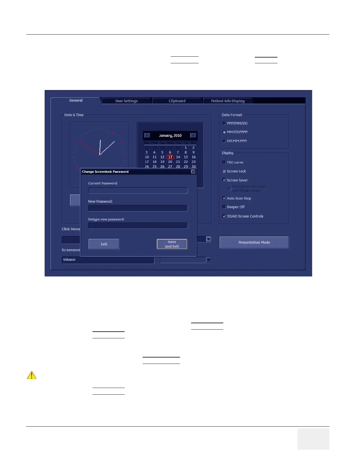 The Screen Lock password cannot be reset by the user! Please contact your GE service representative.