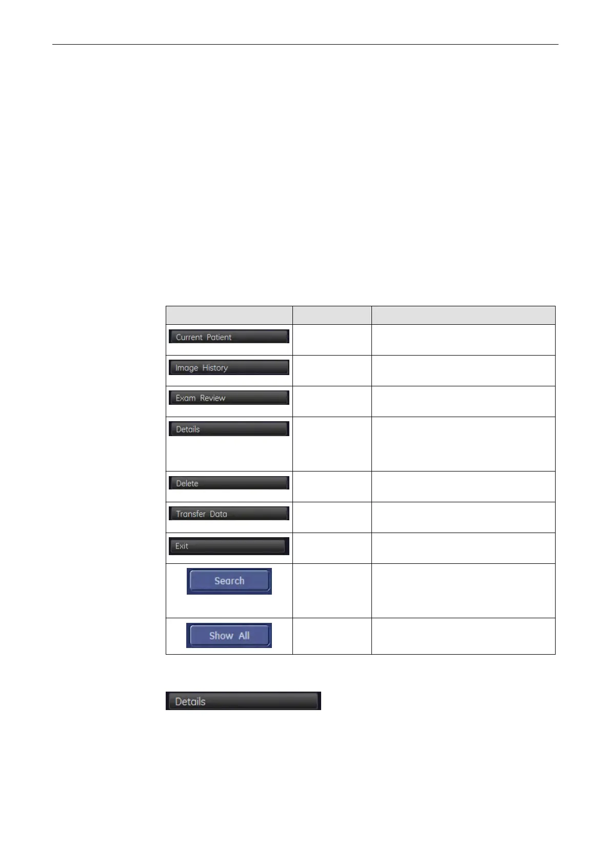 available, when the exam table is active, are listed below and described in