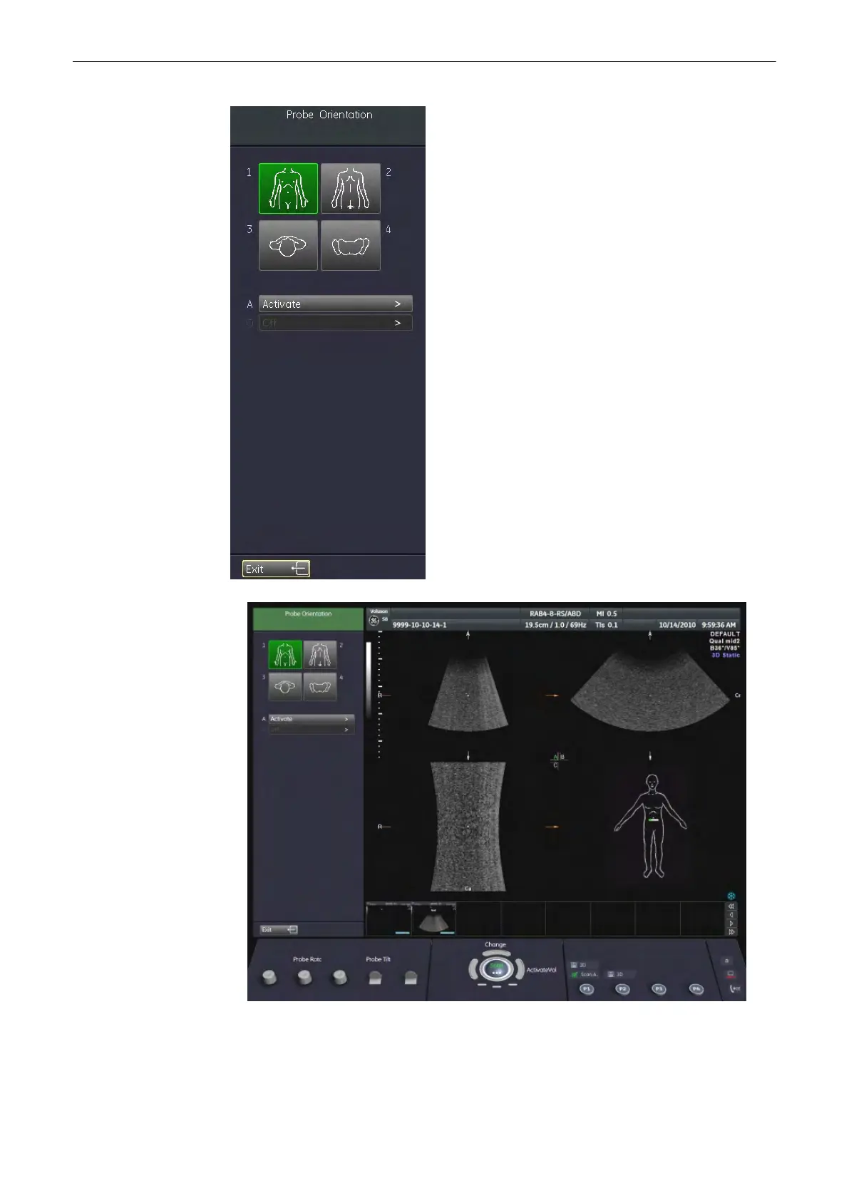 selected visualization mode. Position of body pattern (body view and body rotation) and probe