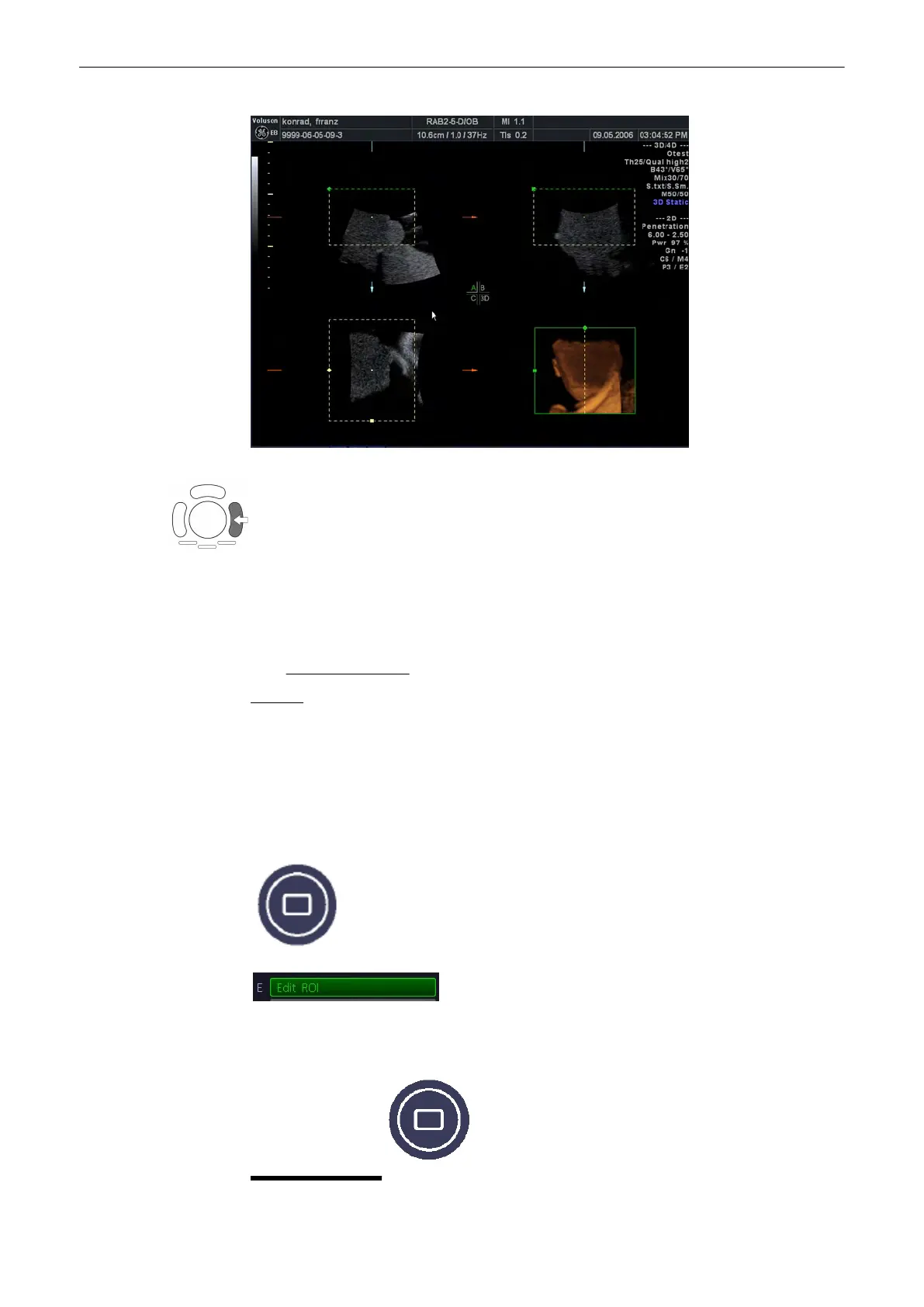 The [Edit ROI] key - in the “Static 3D Render” menu - and the [Quad] screen format key are