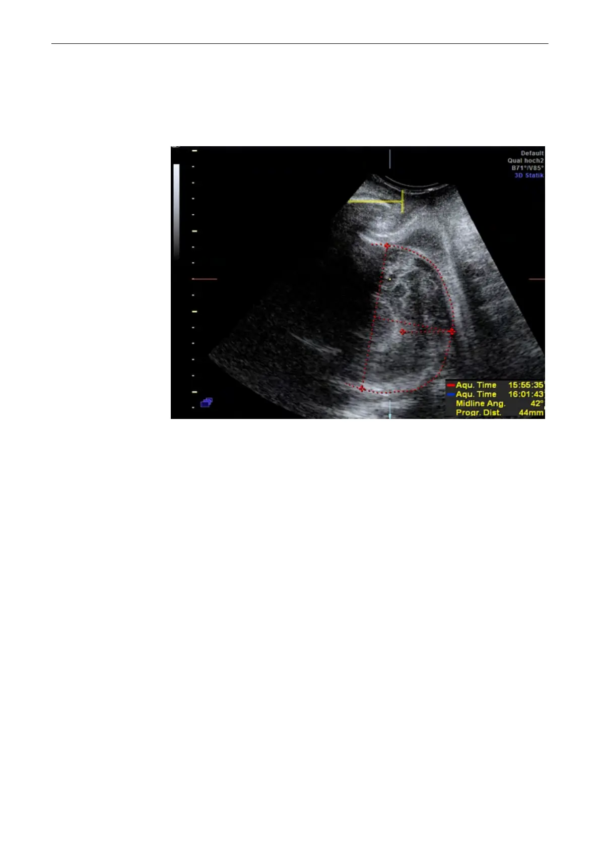 locked to the pubis. Mark the distal point of the fetal head to measure the distance between
