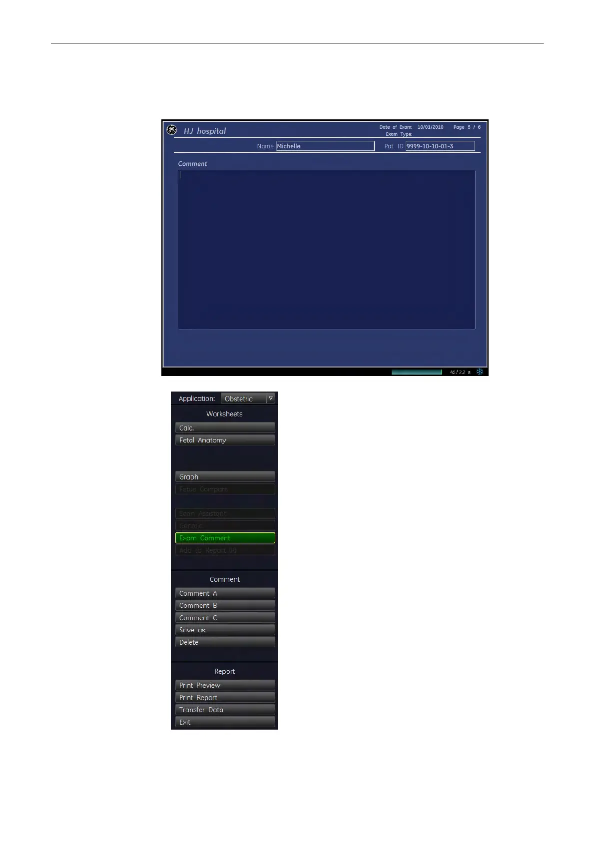 Select the [Exam Comment] key, to view the “Exam Comment” summary report, to enter a