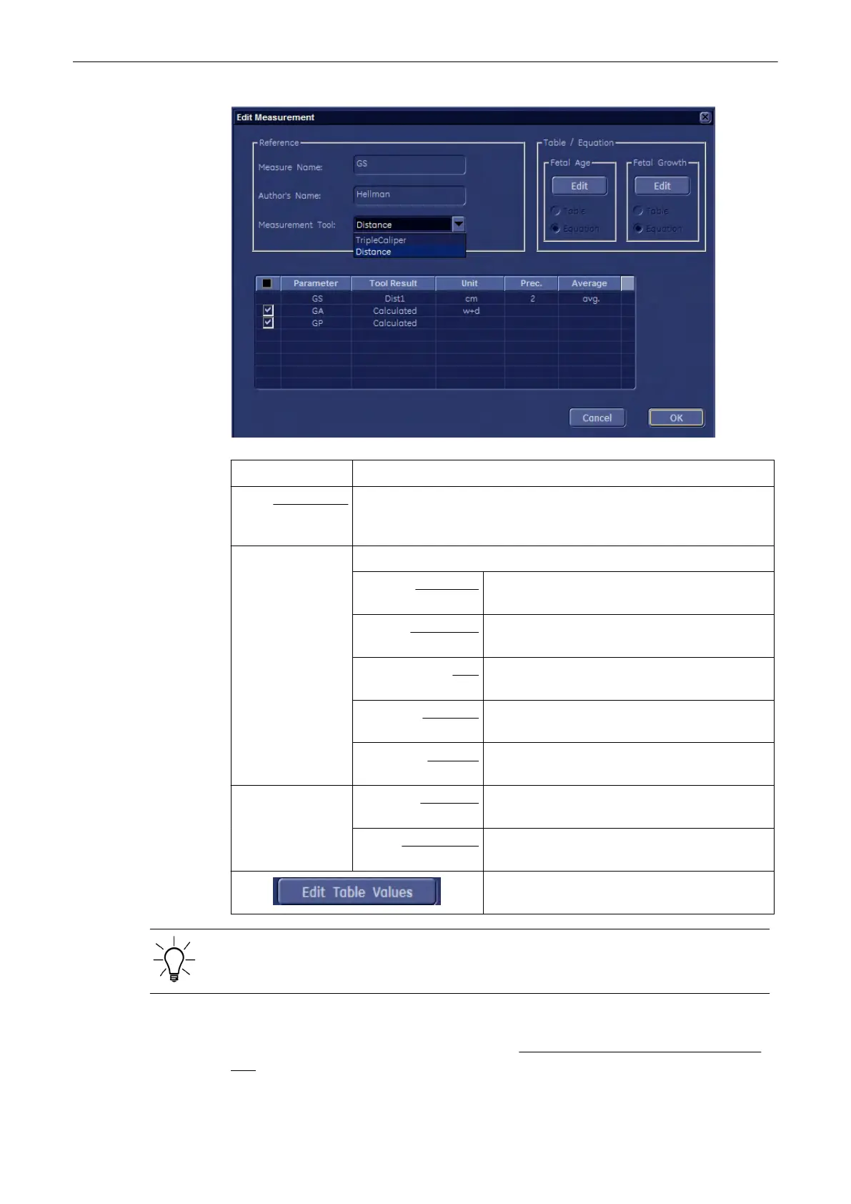 Table / Equation: Fetal Age: select either Table or Equation and then click