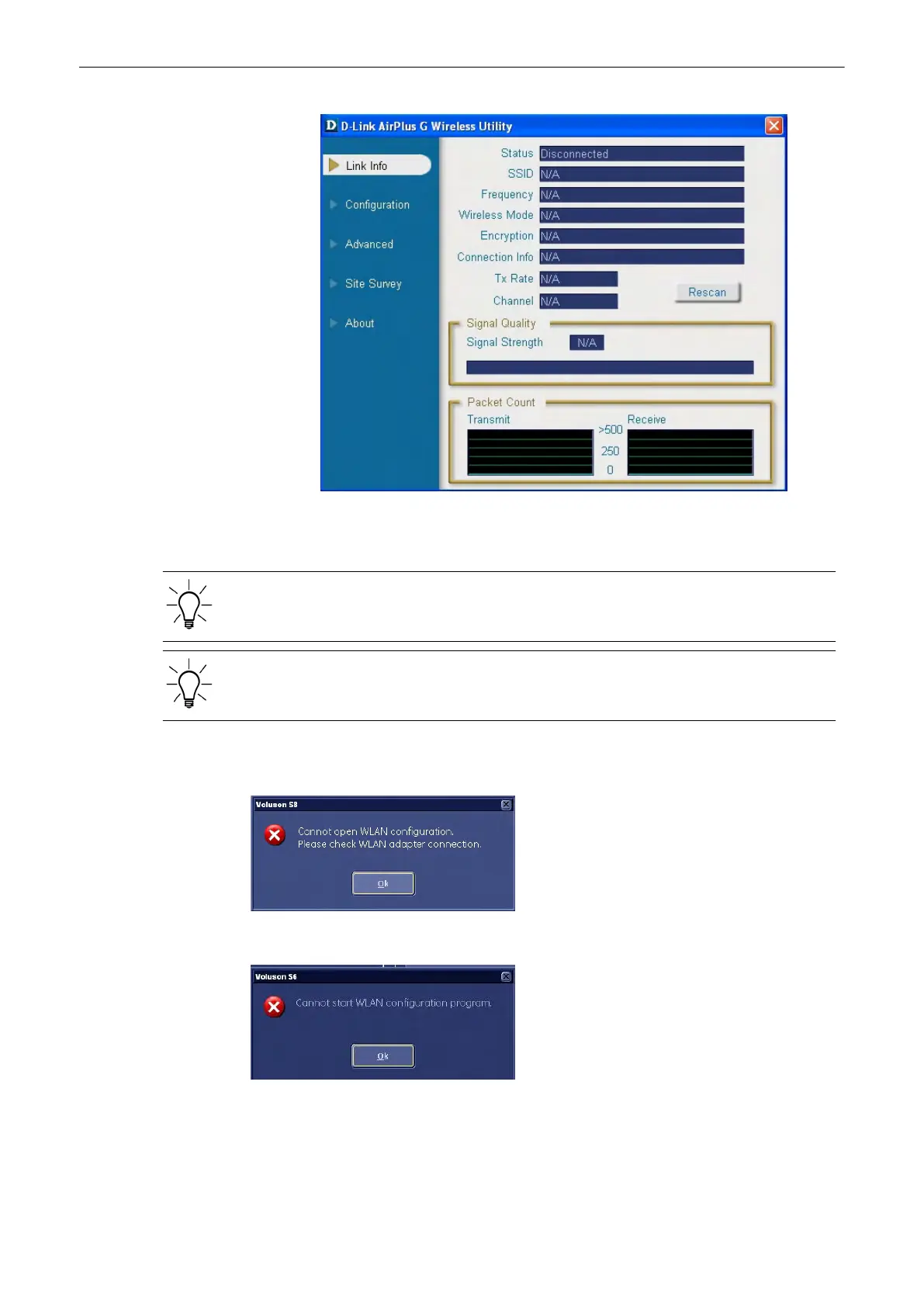 If no WLAN adapter is connected or the hardware is defect the following dialog appears: