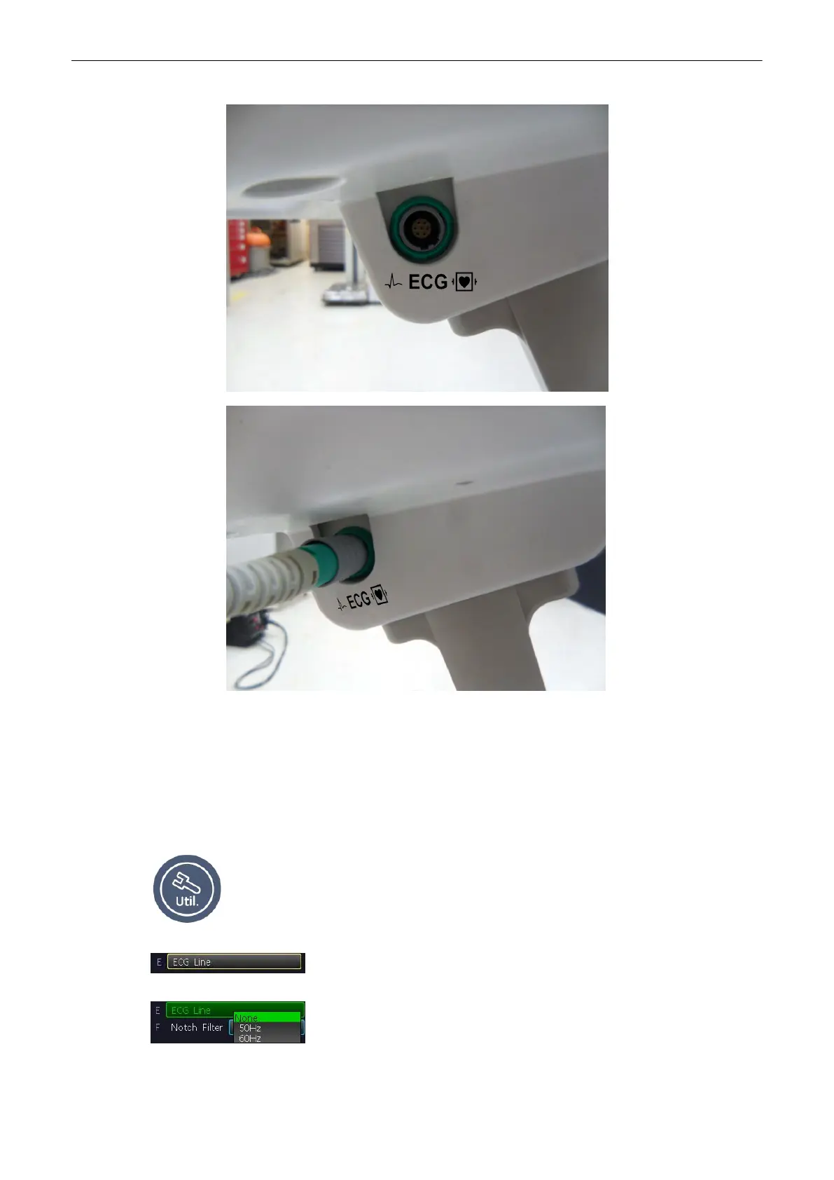 The ECG function is switched on and off by pressing the [ECG Line] button in the Utilities