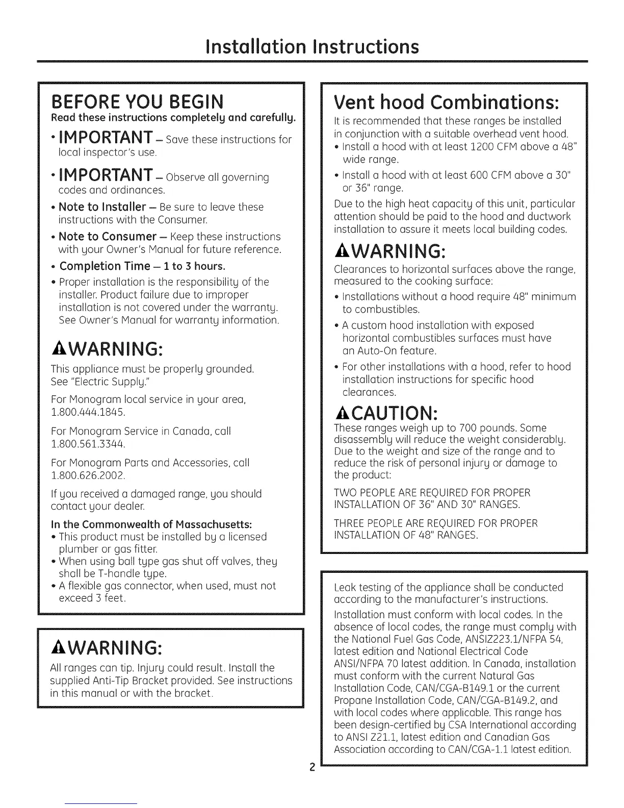 INSTALLATION OF 36" AND 30" RANGES.