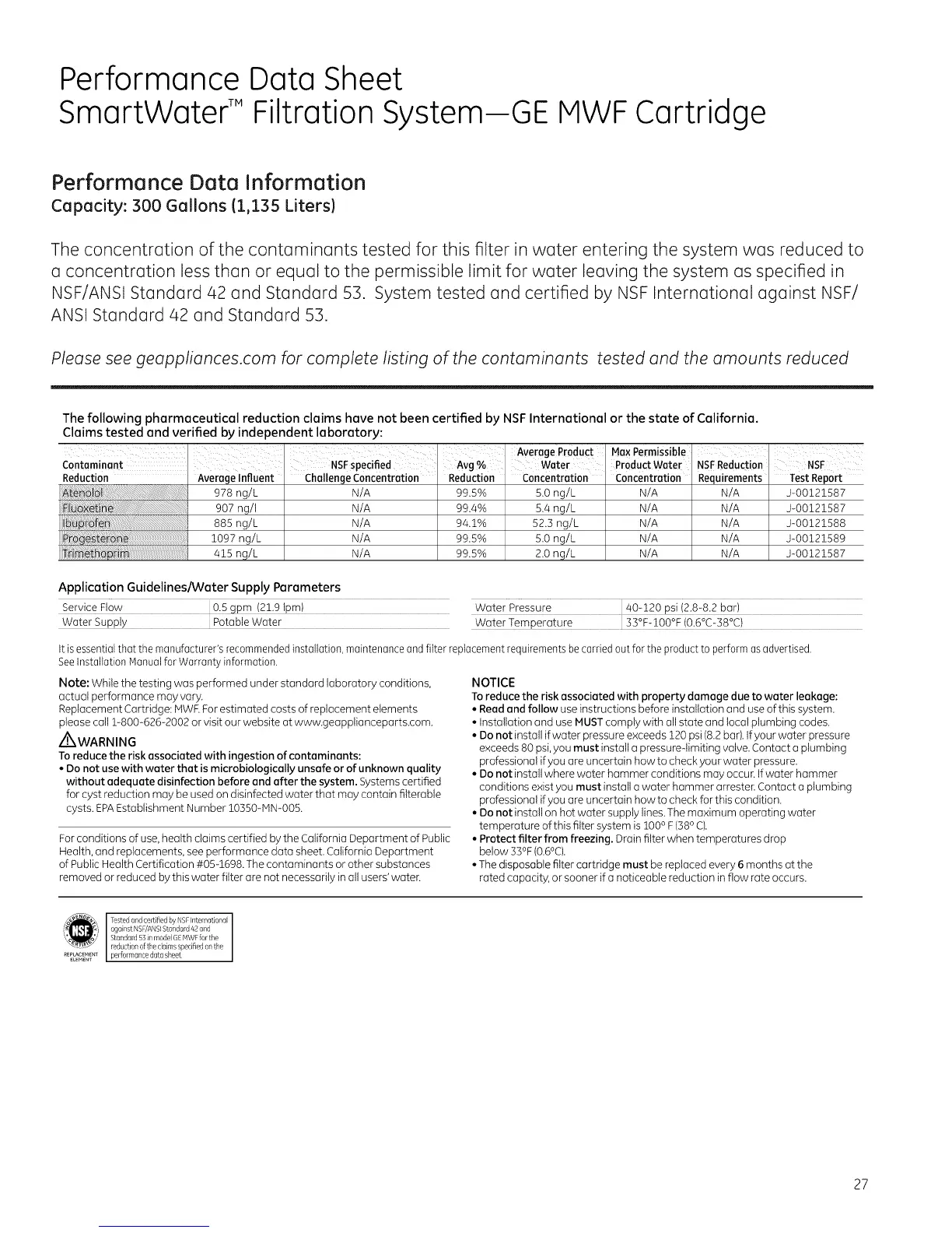 Please see geappliances.com For complete listing of the contaminants tested and the amounts reduced