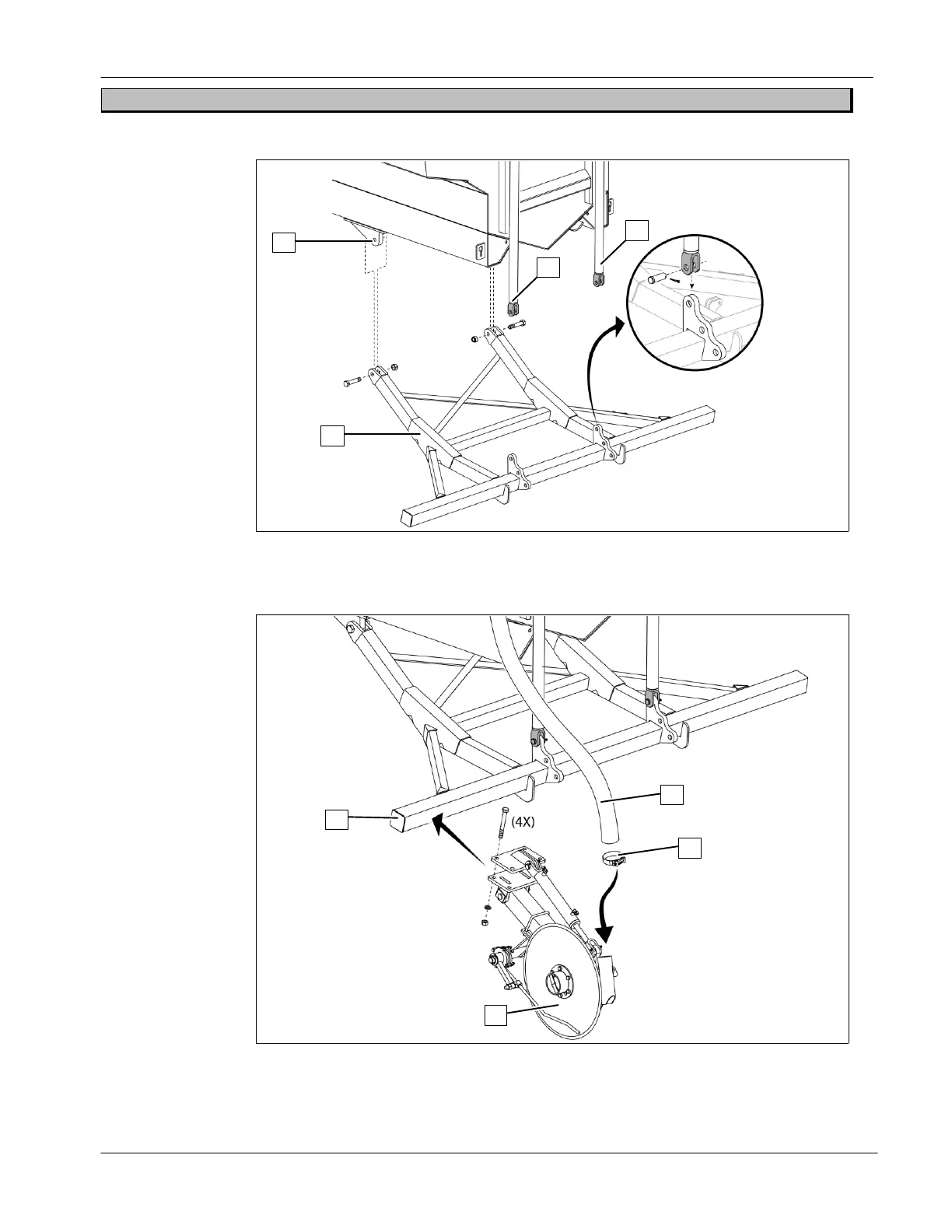 ● Bolt the tool bar (1) to the spreader frame (2) using provided hardware;