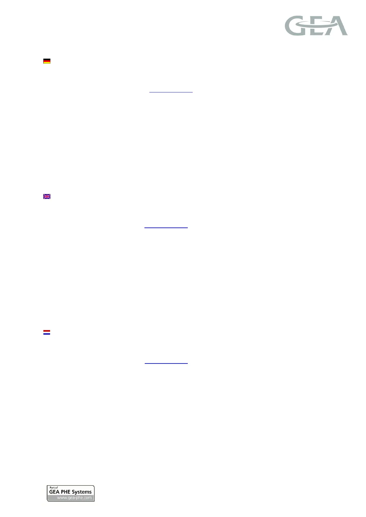 Declaration of Conformity: see homepage www.gea-phe.com; News & Downloads