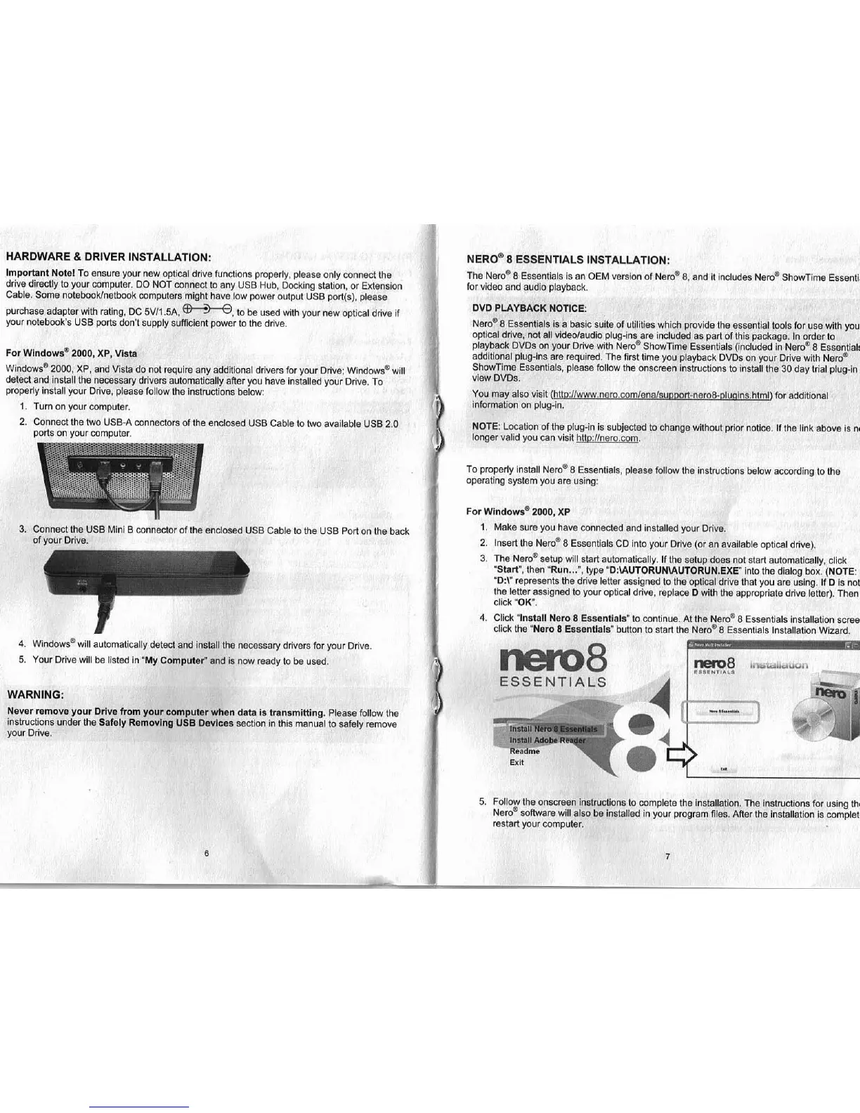 Gear Head 8XDVDEXT - Hardware and Driver Installation; Windows 2000, XP, Vista Driver Install; Software Installation; Nero 8 Essentials for Windows 2000;XP