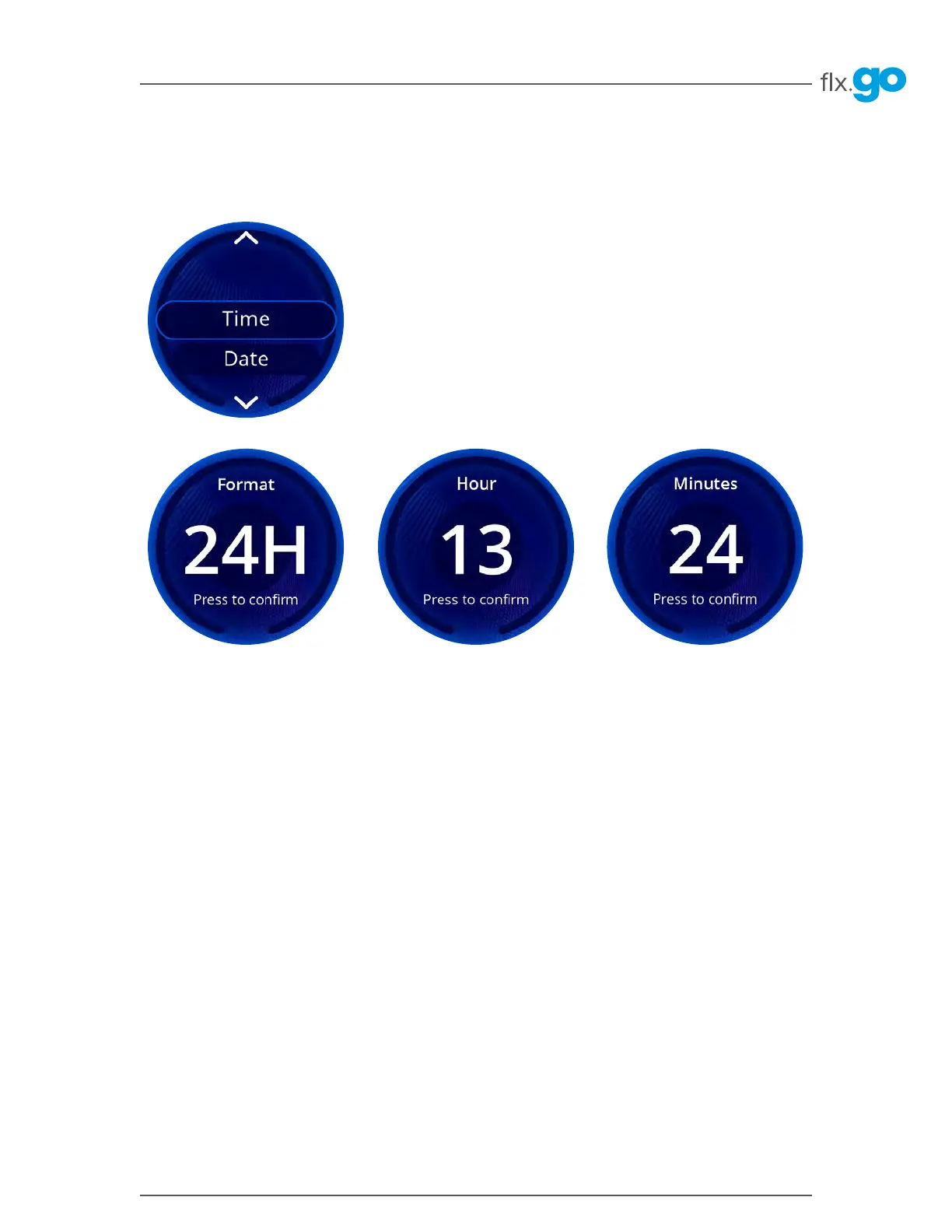 To change time in the flx�go, press on Date & Time in the Settings menu� Press on Time� Use the the dial ring to select