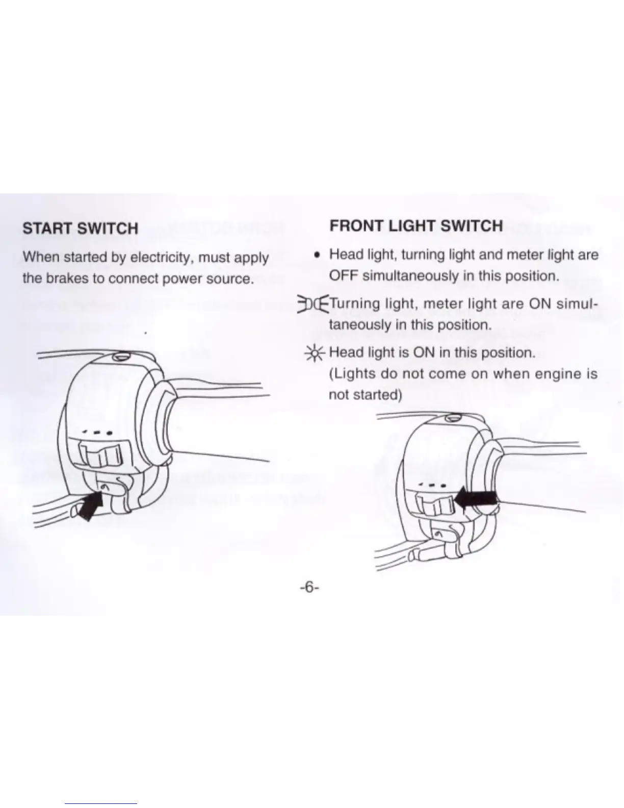 Geely JL50QT-21 - Starting System and Lighting Controls; Electric Start Switch Function; Front Light Switch Settings