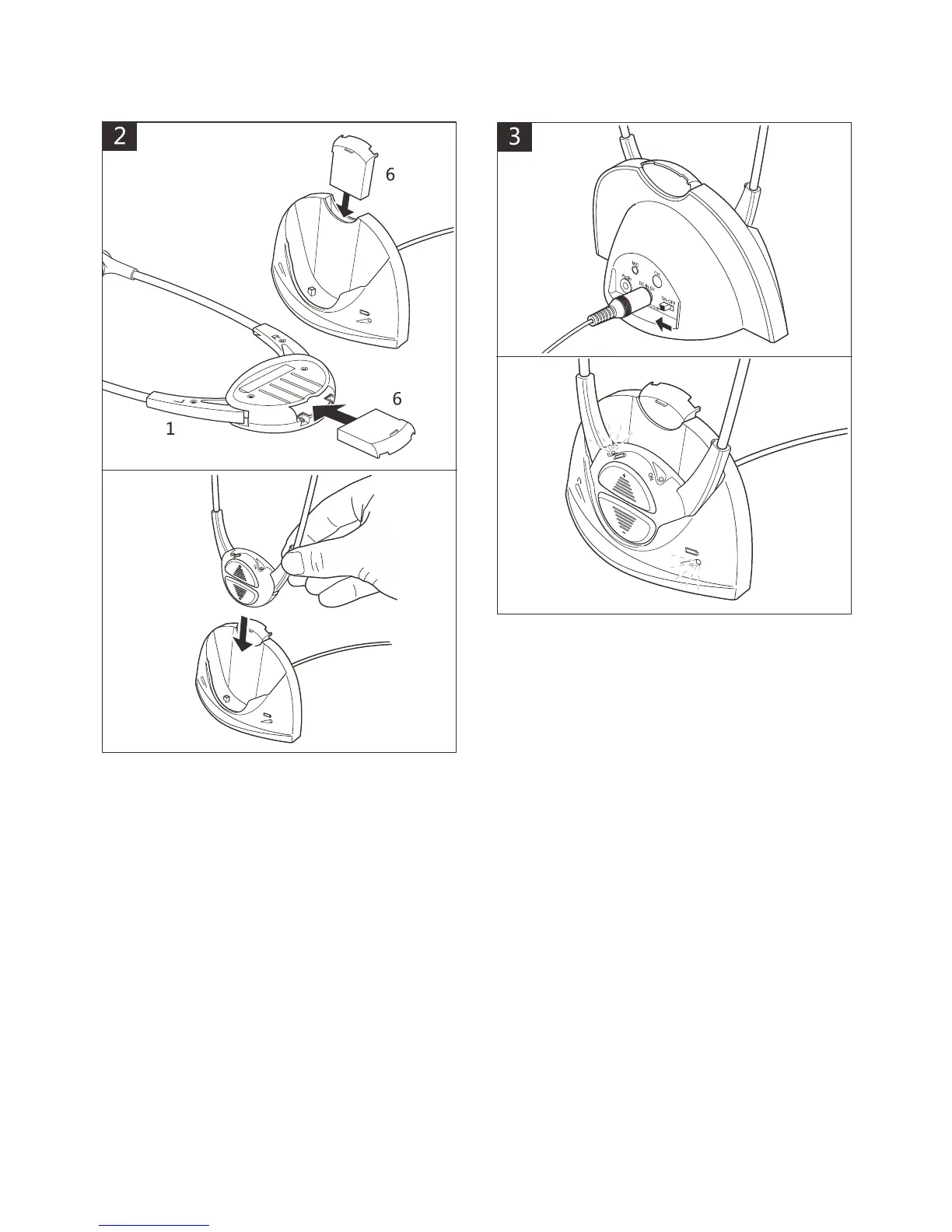 Insert batteries (6) into Headset and