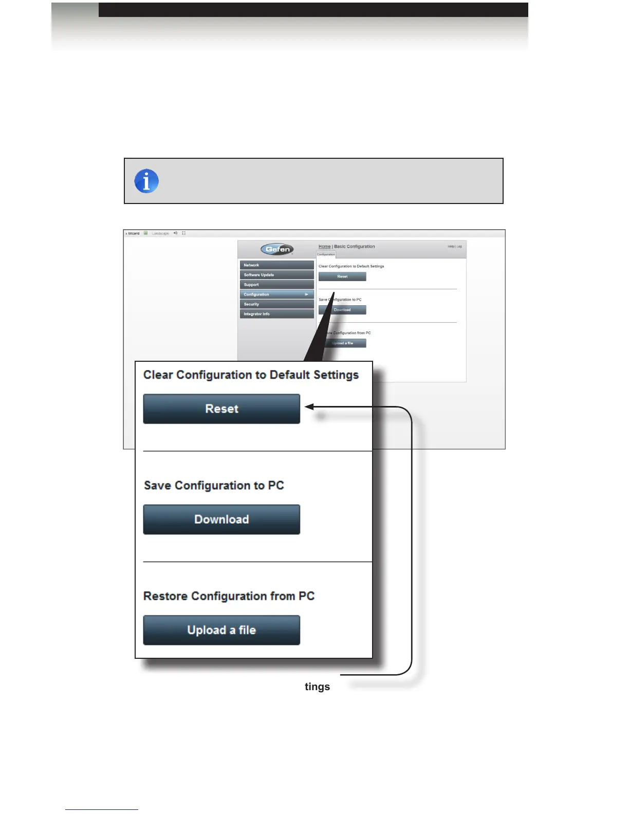 The Conguration sidebar button allows you to Reset the GAVA back to Factory defaults,
