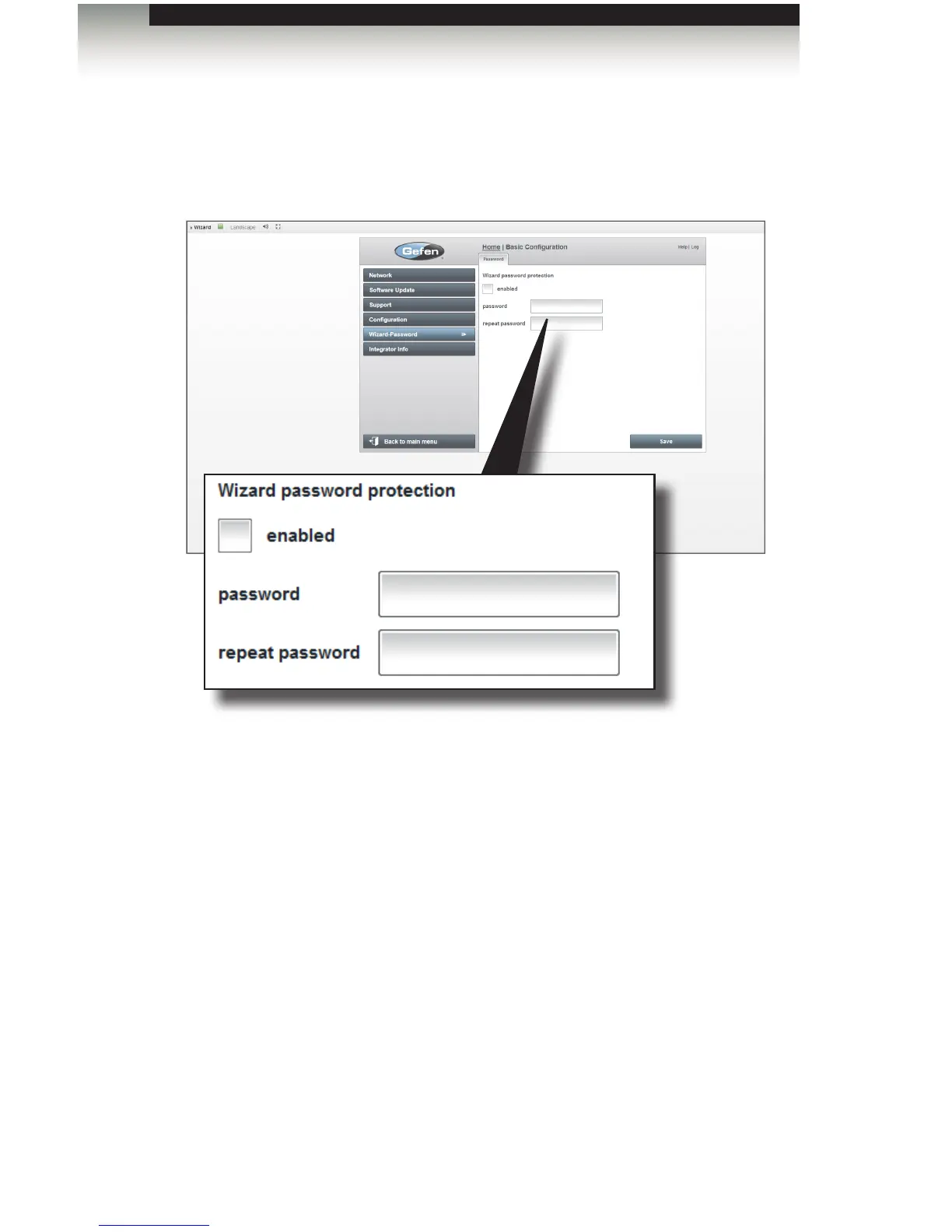 The Security sidebar button allows the integrator or the end-user to password-protect the