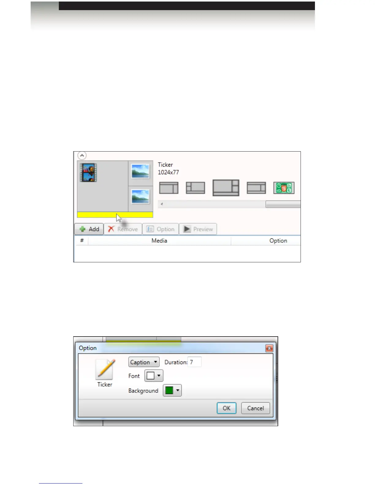 Click the Option button, above the Media window, or right-click the ticker le