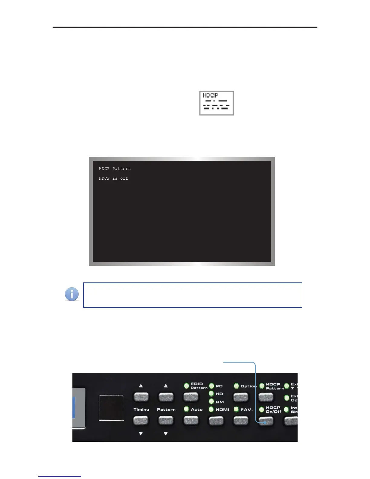 By default, HDCP is disabled. Press the [HDCP] button on the front panel to enable