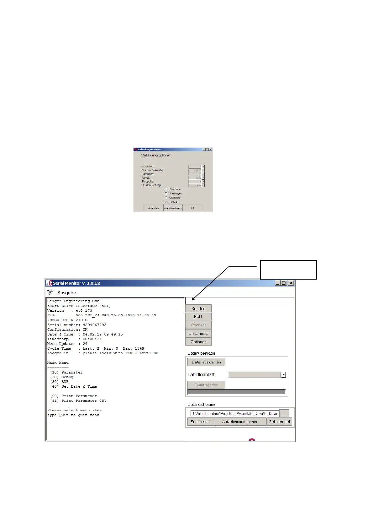 Now please push the button „connect“ and type the word „menu“ in the command line and then press return.
