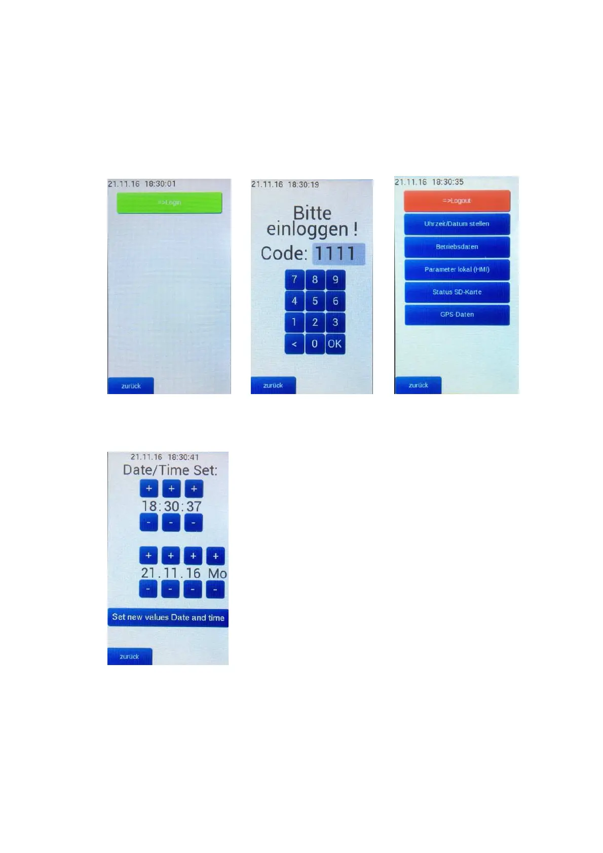Login Buttons erscheint der Login Bildschirm, hier den Code „1111“ eingeben und ok betätigen, es erscheint