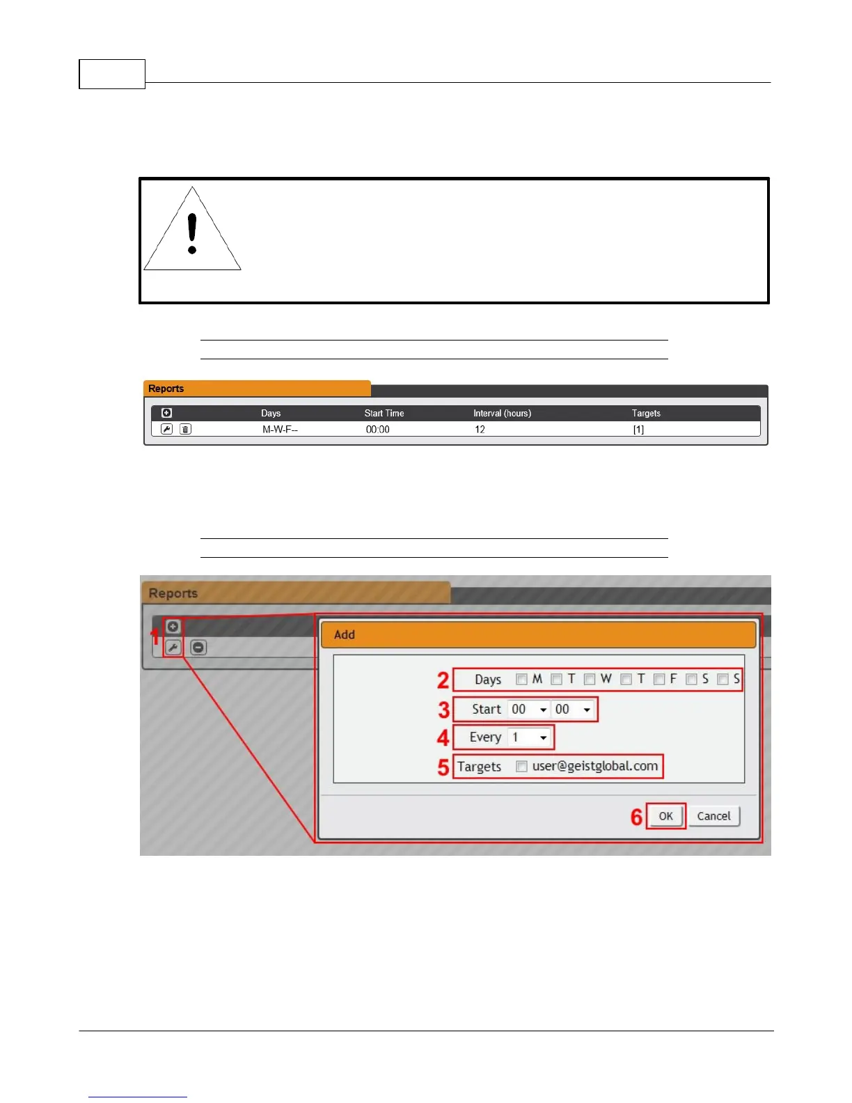 The Reports page allows the user to schedule the device to send recurring status reports.