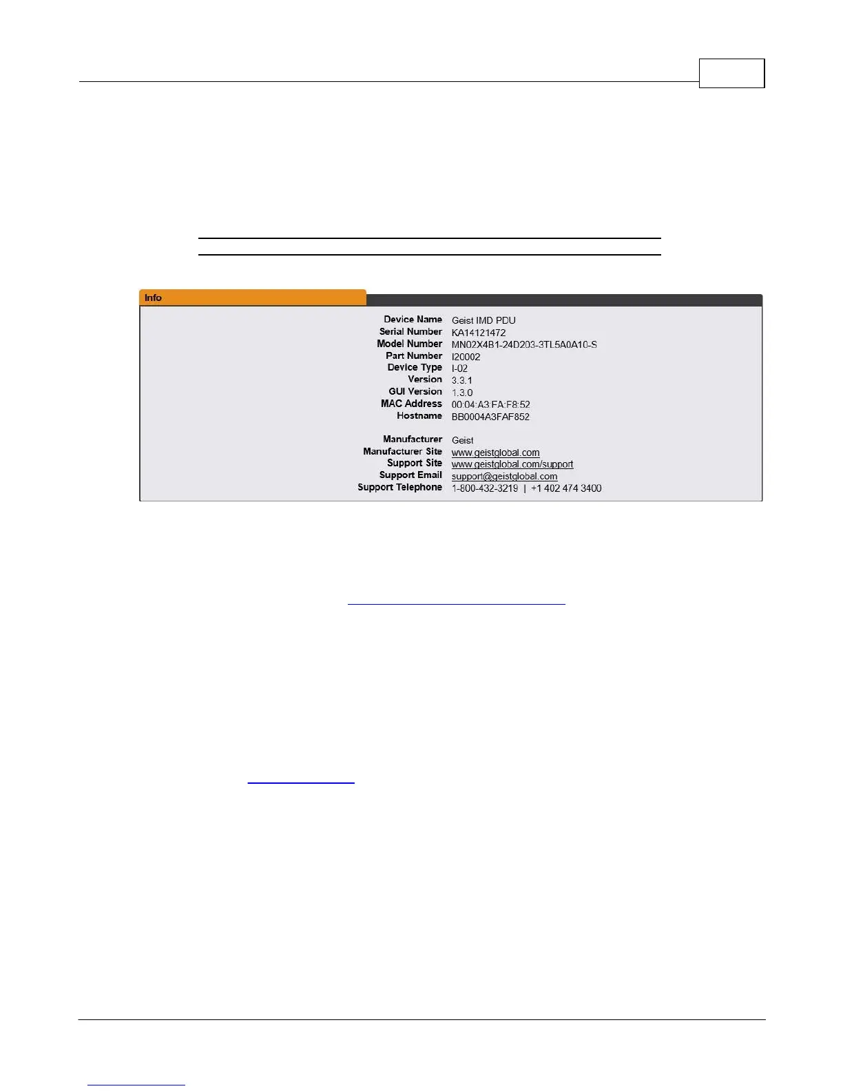 The Info Page displays the unit's current configuration information, including the device name and ID,