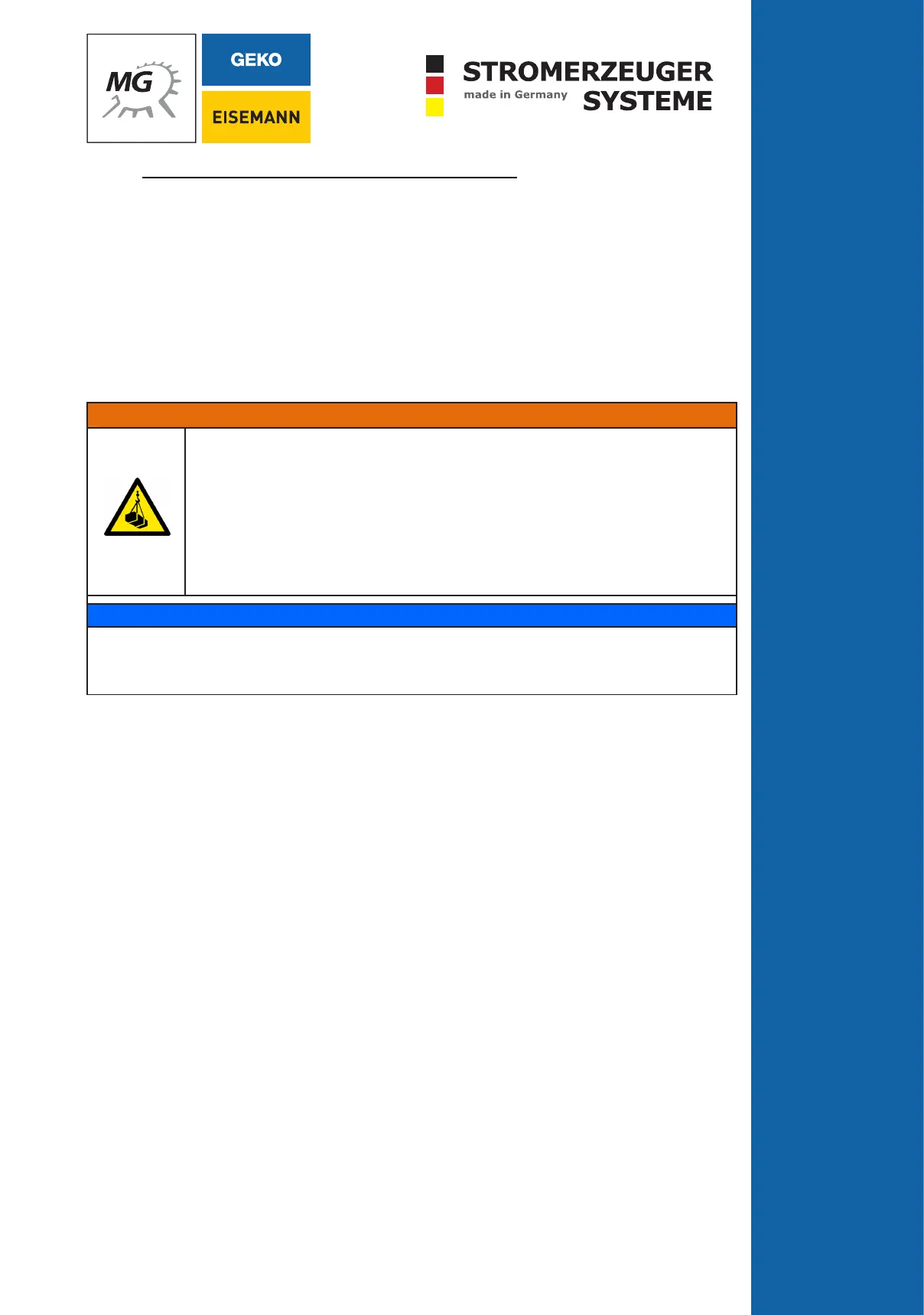 • Anschlagmittel müssen für das Gewicht des Stromerzeugers zugelassen sein