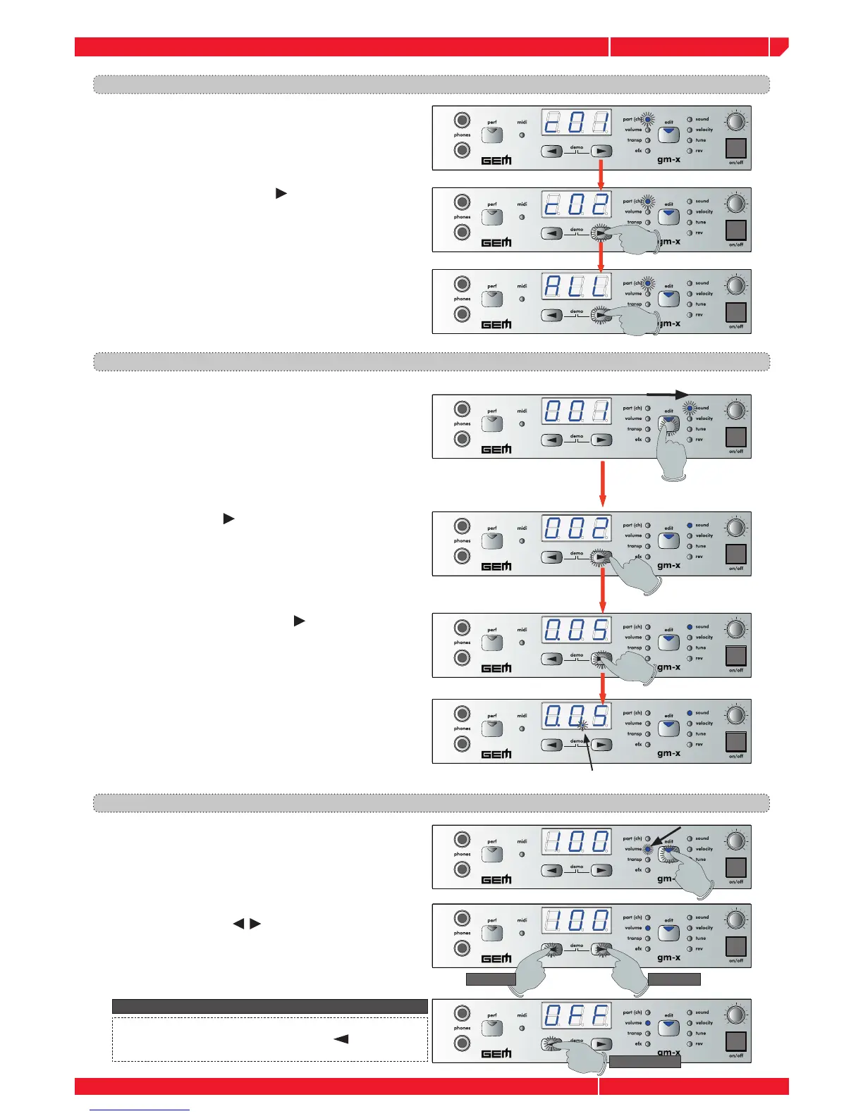 The GM-X has 4 sound banks in total. From bank 0 (no dot light up