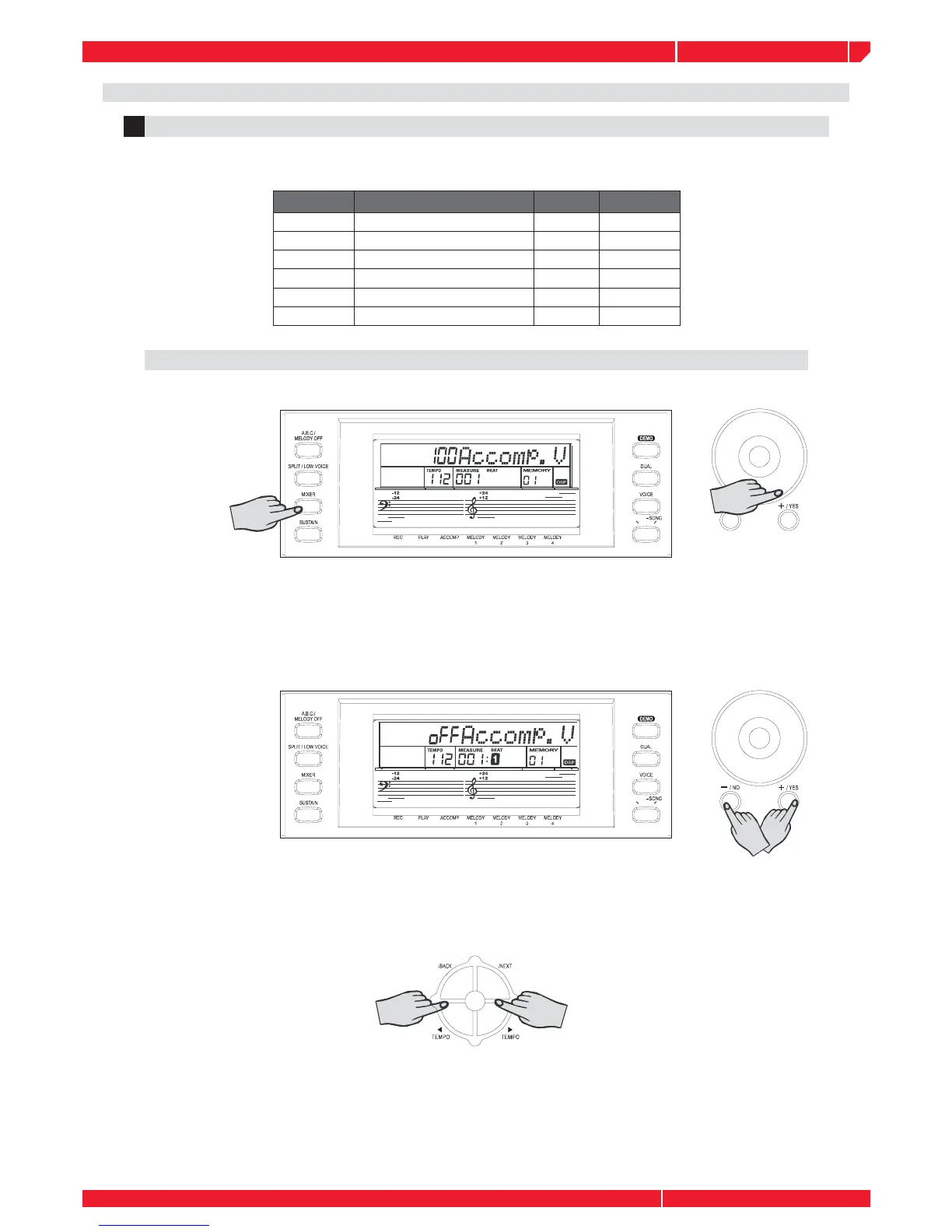 You can adjust the volume values of ACCOMP with the [+/YES] [-/NO] buttons, the DIAL.