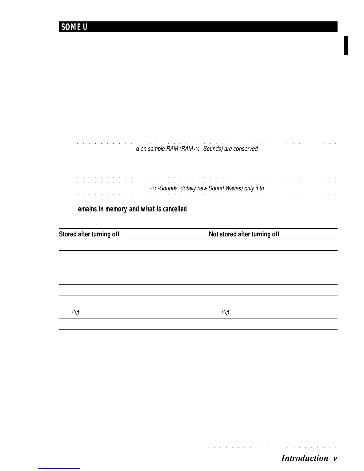 WARNING- Sounds based on sample RAM (RAM -Sounds) are conserved after power down only if the