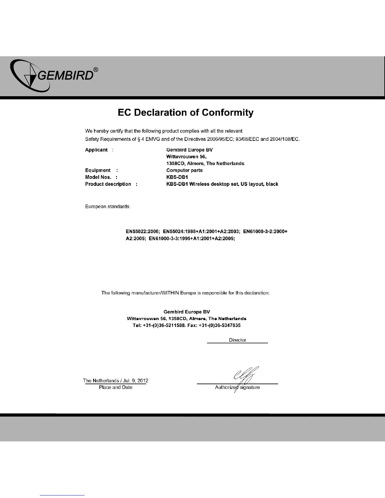 Gembird KBS-DB1 - EC Declaration of Conformity