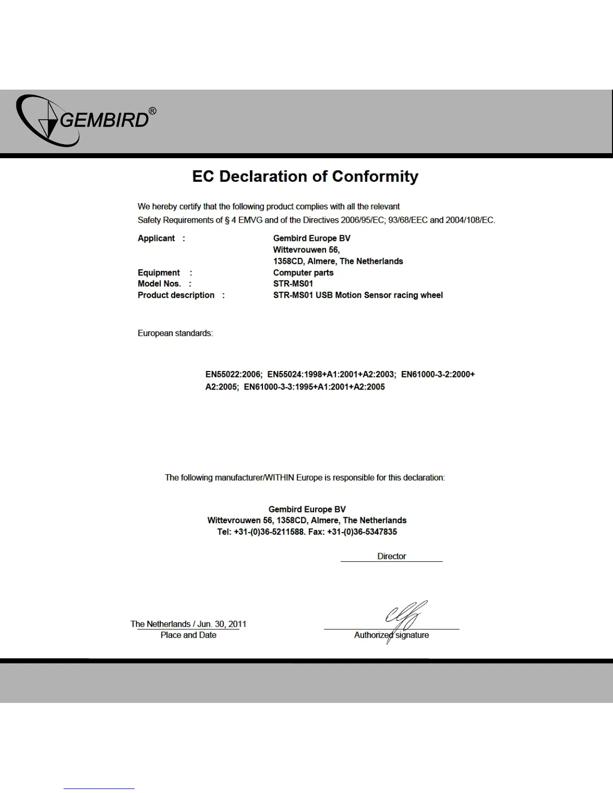 Gembird STR-MS01 - Regulatory Compliance and Safety; EC Declaration of Conformity