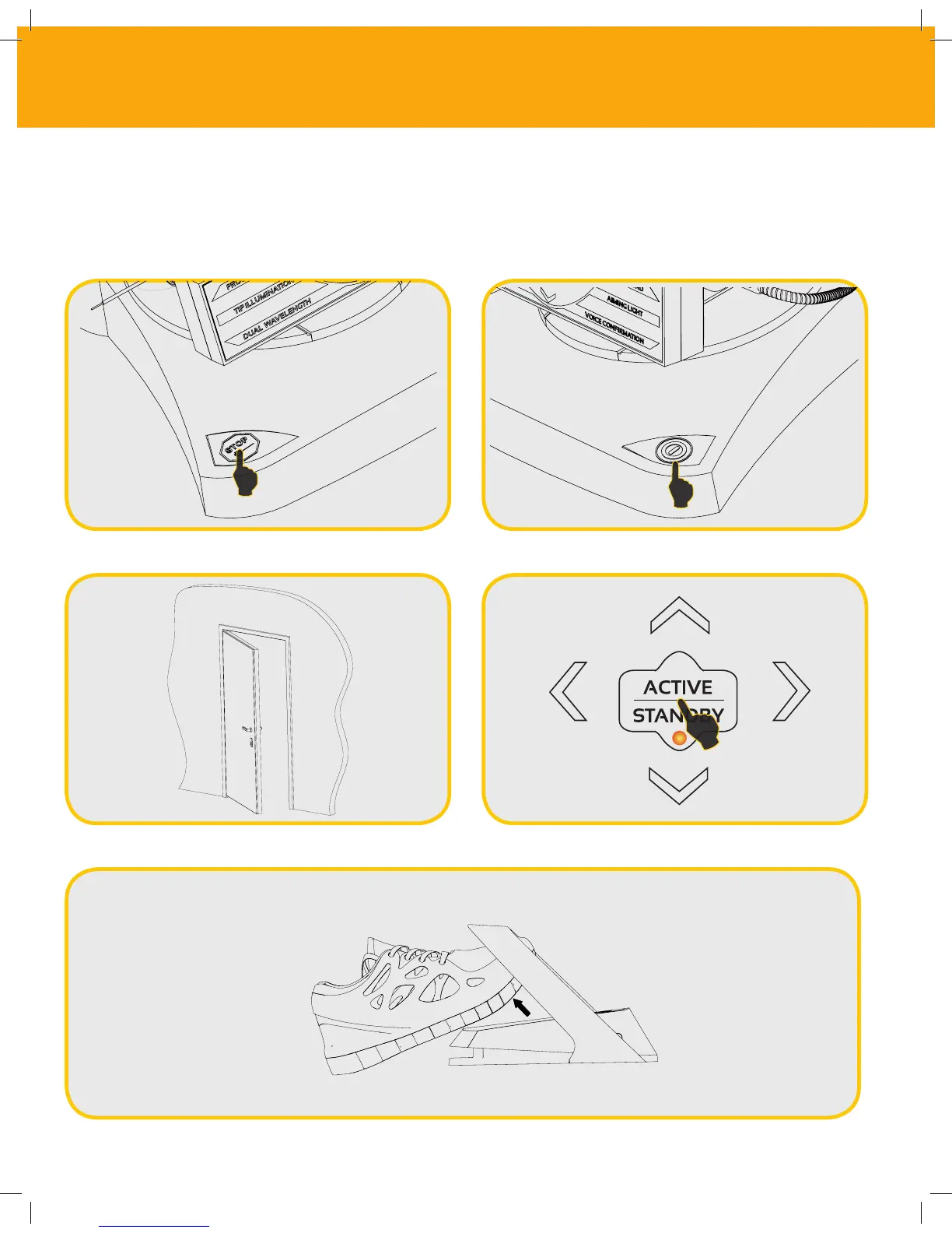 Press the emergency “STOP” button. Press the “ON/OFF” button.