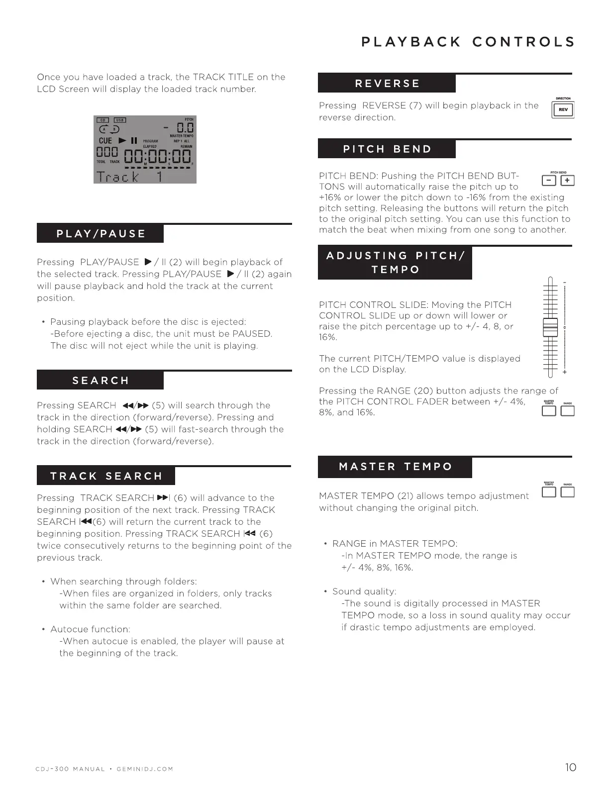 Gemini CDJ-300 - Playback Controls; Basic Playback Functions; Pitch and Tempo Adjustments