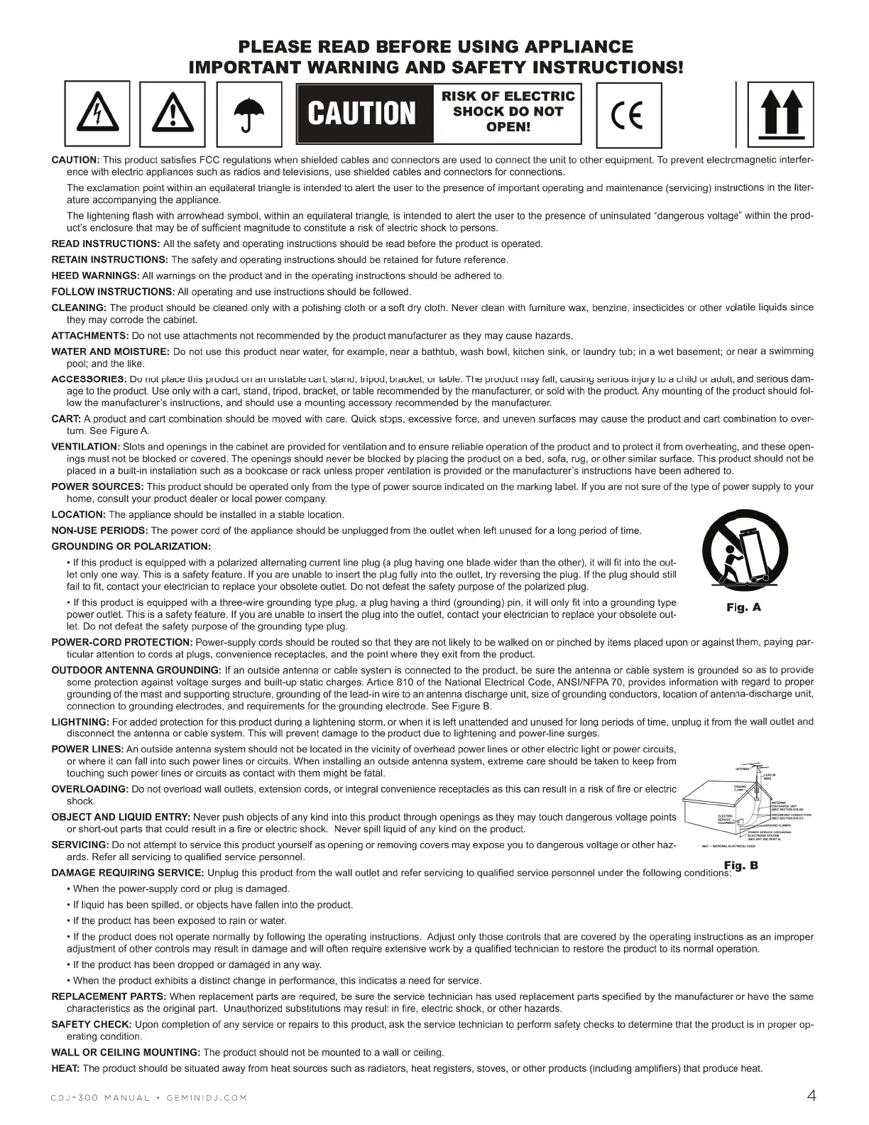 Gemini CDJ-300 - Important Safety Instructions; General Safety and Operation; Electrical and Power Safety; Servicing and Maintenance Safety