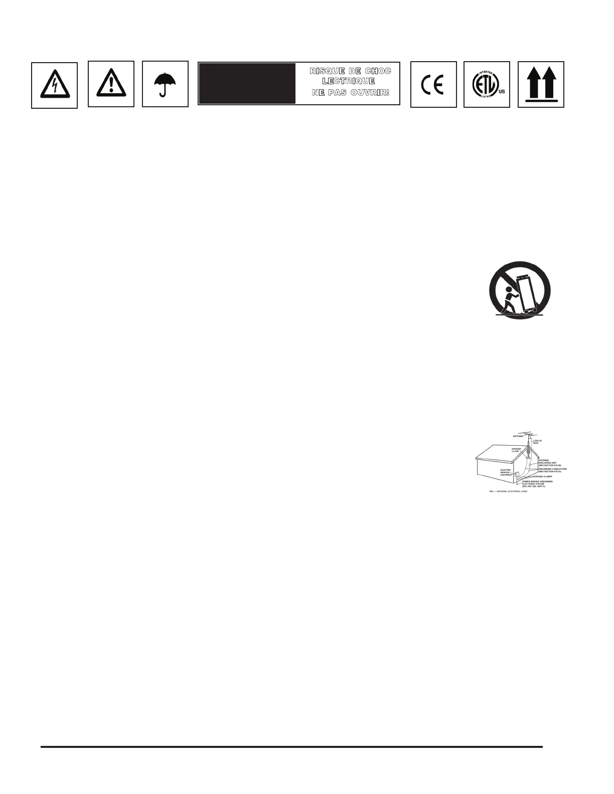 ORAGE/FOUDRE: En cas d'orage et de non utilisation prolongée, débranchez le cordon d'alimentation, le câble d'antenne et les cordons