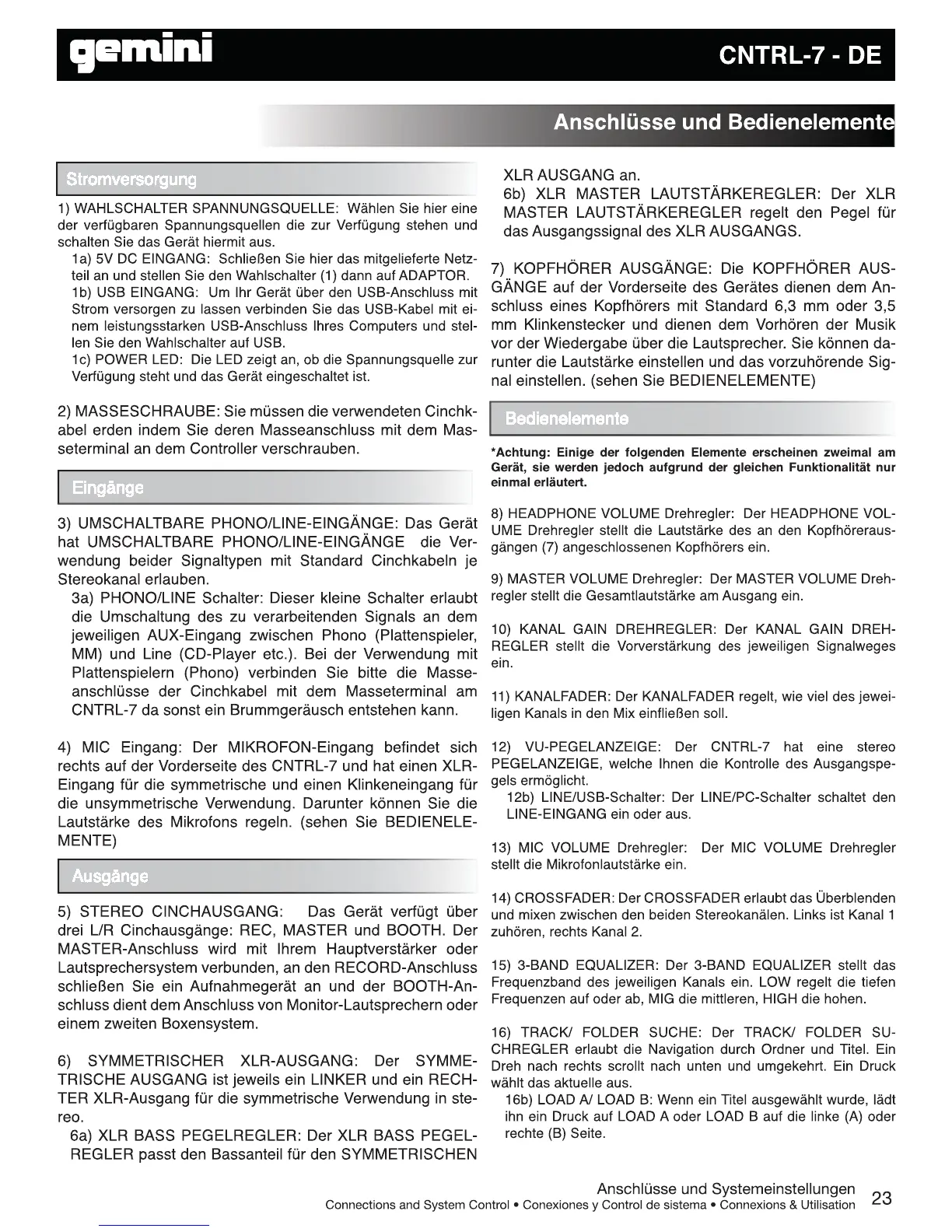 Gemini CNTRL-7 - Anschlüsse & Handhabung