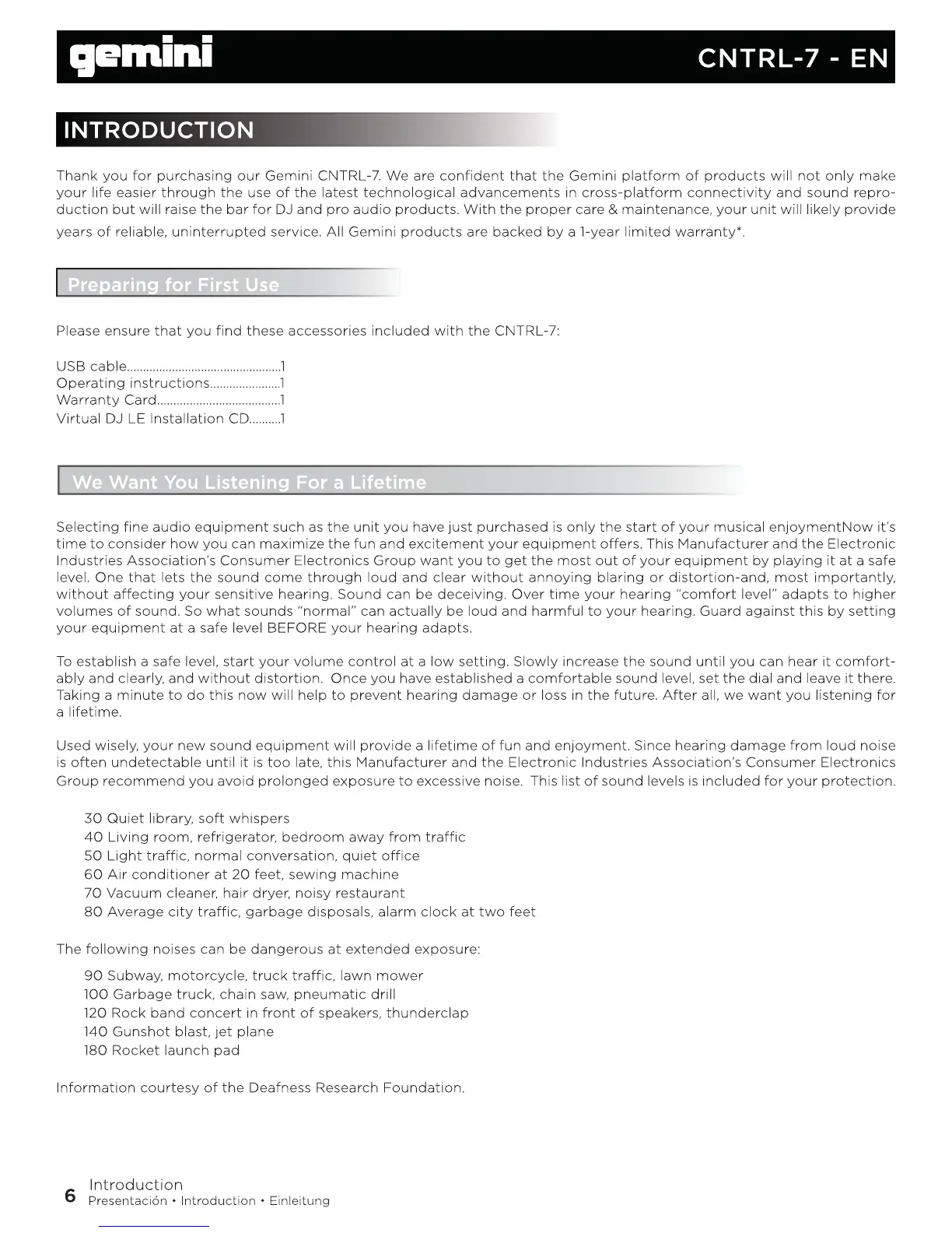 Gemini CNTRL-7 - Introduction; Preparing for First Use; Safe Listening Levels