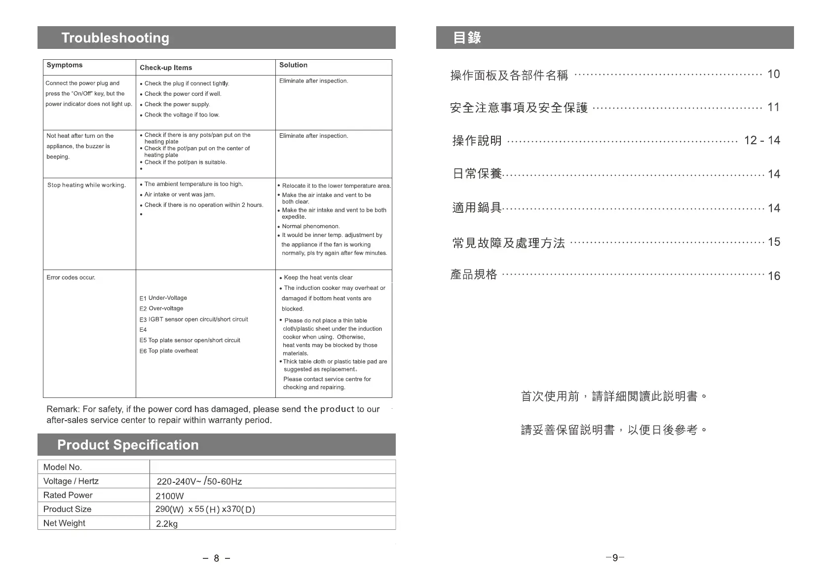 smaller than 8CM in diameter on heating panel.