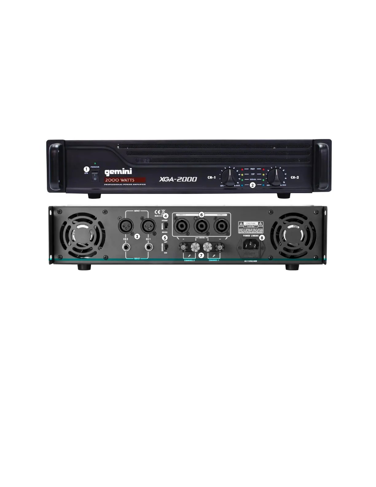 2. Kanaal 1/kanaals 2 volumeknop: past het volume van de versterker aan.