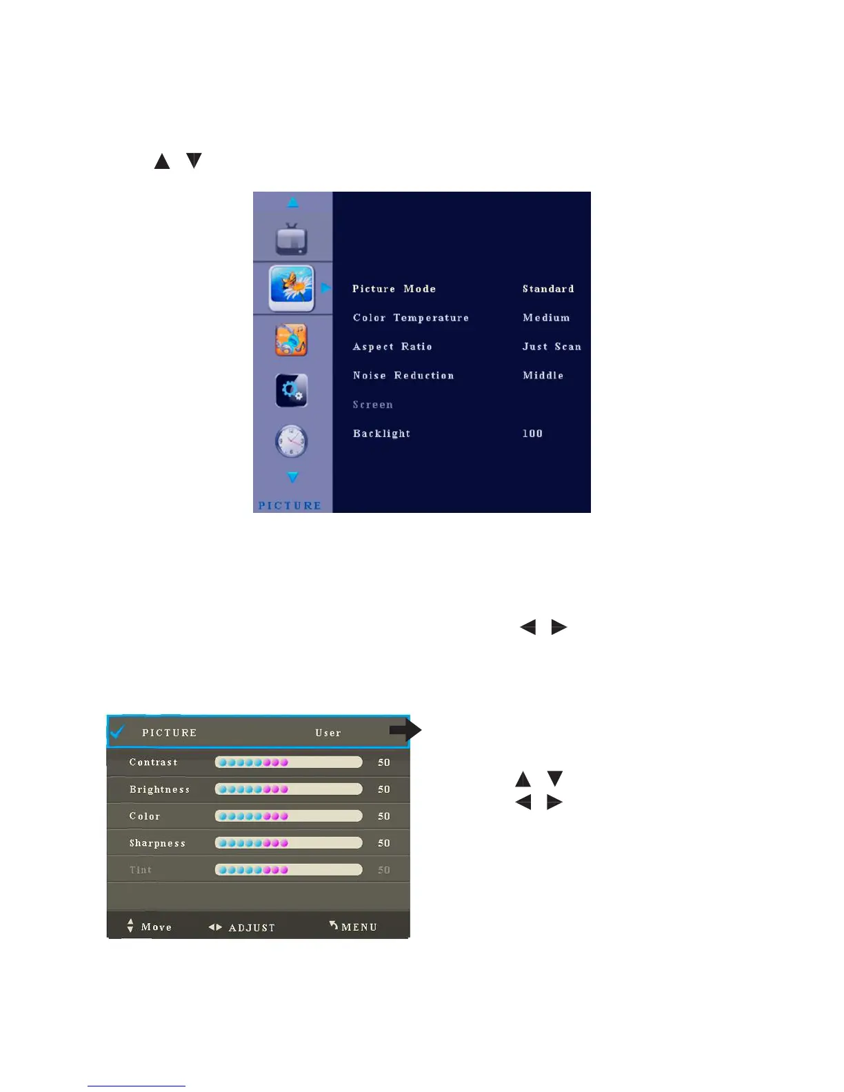 Mode, Colour Temperature, Aspect Ratio, Noise Reduction, Screen and Backlight.
