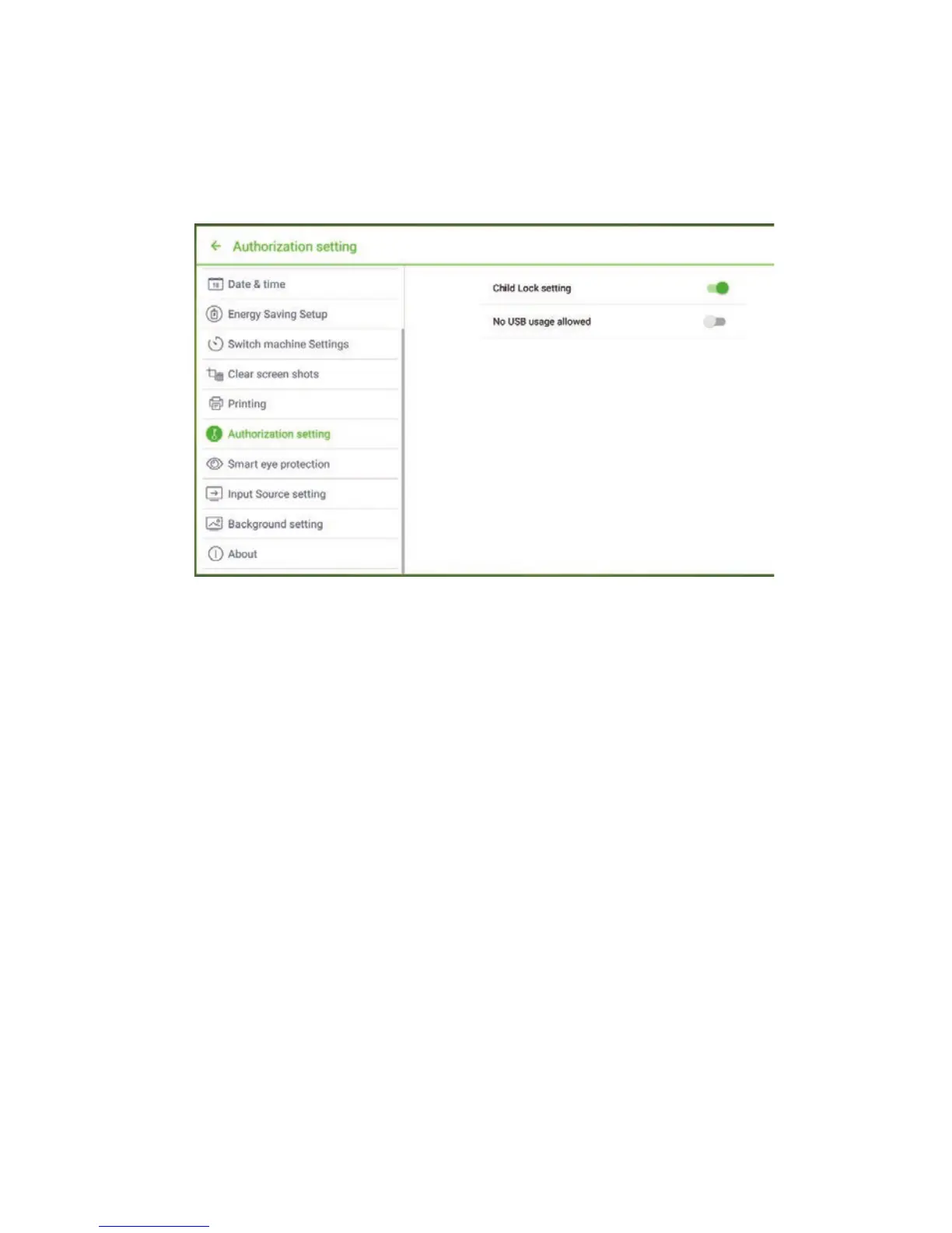 Authorization setting item to turn on the Child Lock function.