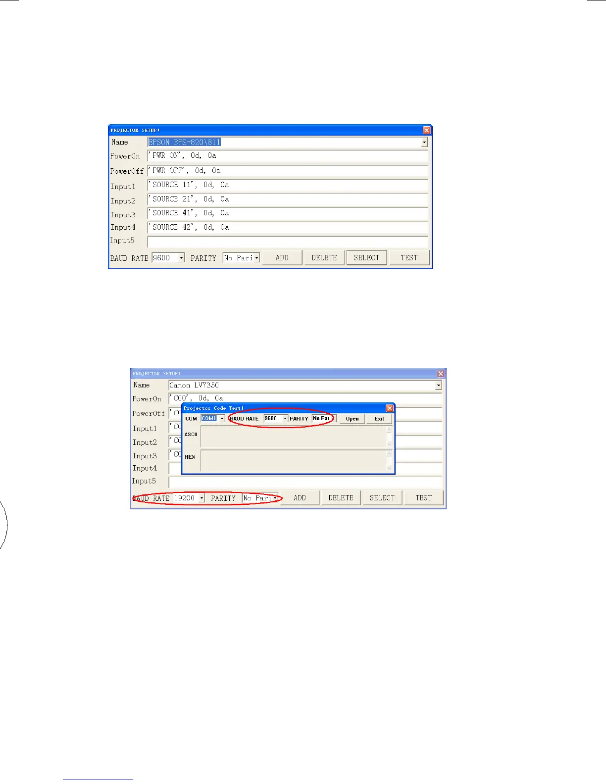 from the RS232 port rst) and select the Baud Rate and Parity based on the projector’s