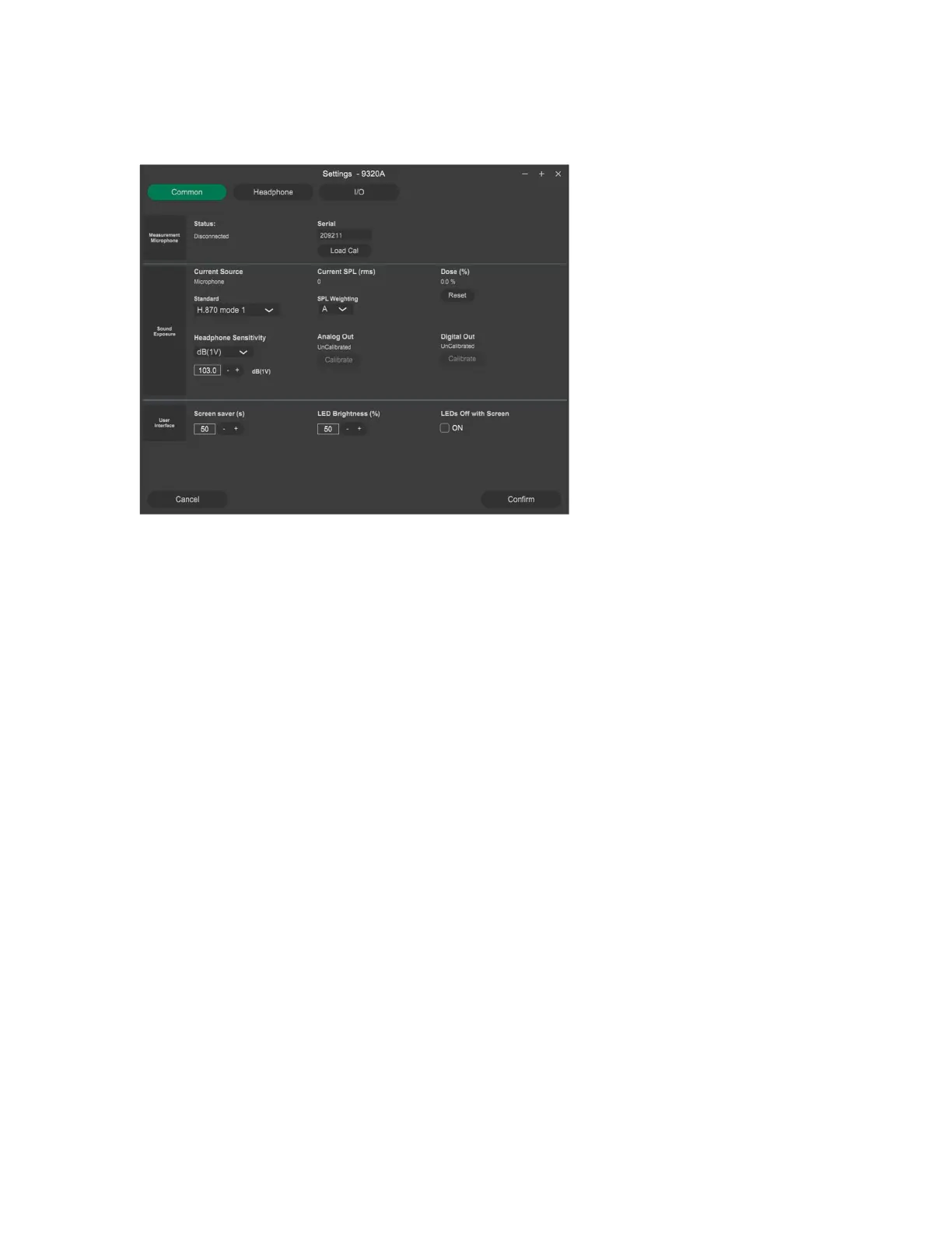 Fig. 29. The configuration display of 9320 has three sub-pages, “common”, “headphone” and “I/O”.