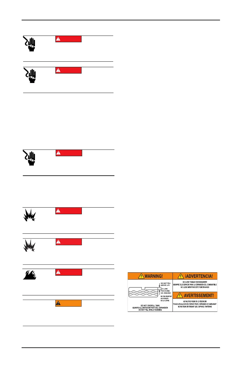 Explosion and Fire. Do not overfill fuel tank. Fill to