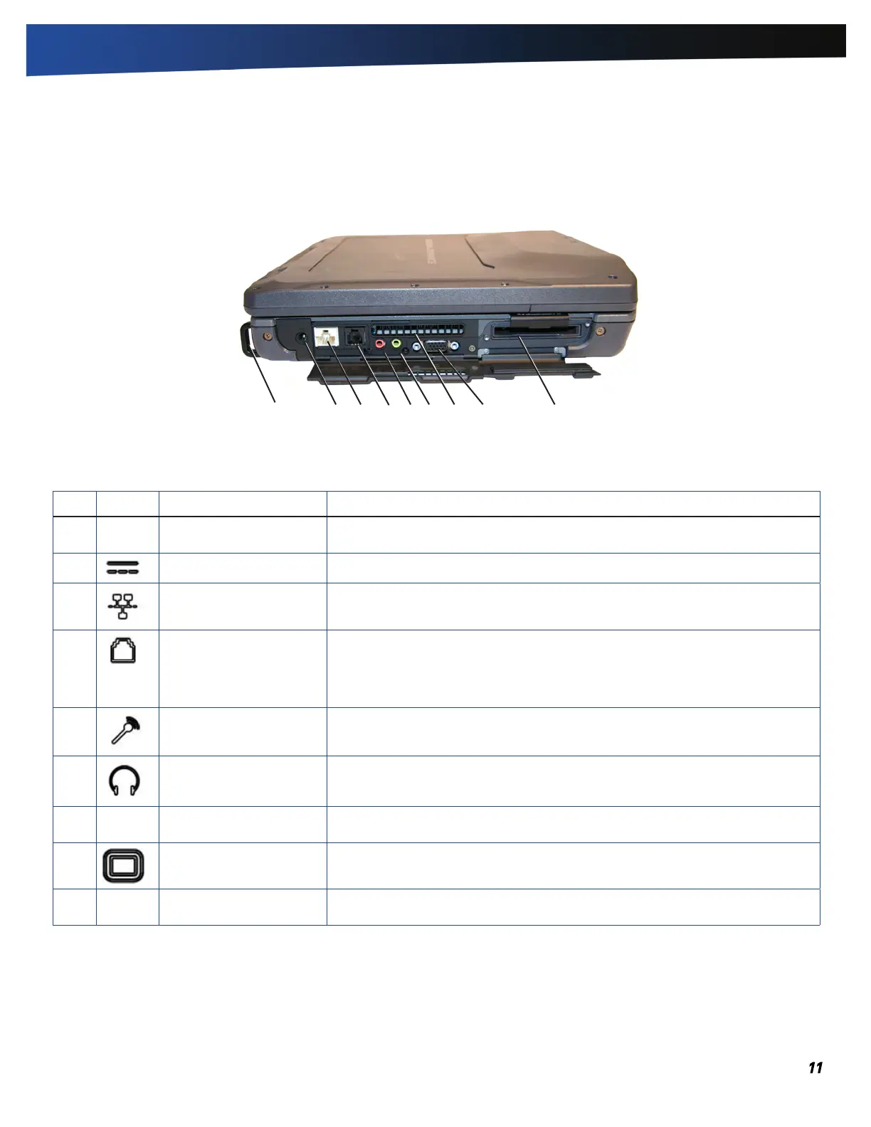 4 Modem Jack (RJ11) Connects a phone line to the internal fax/data modem. It can transmit data using
