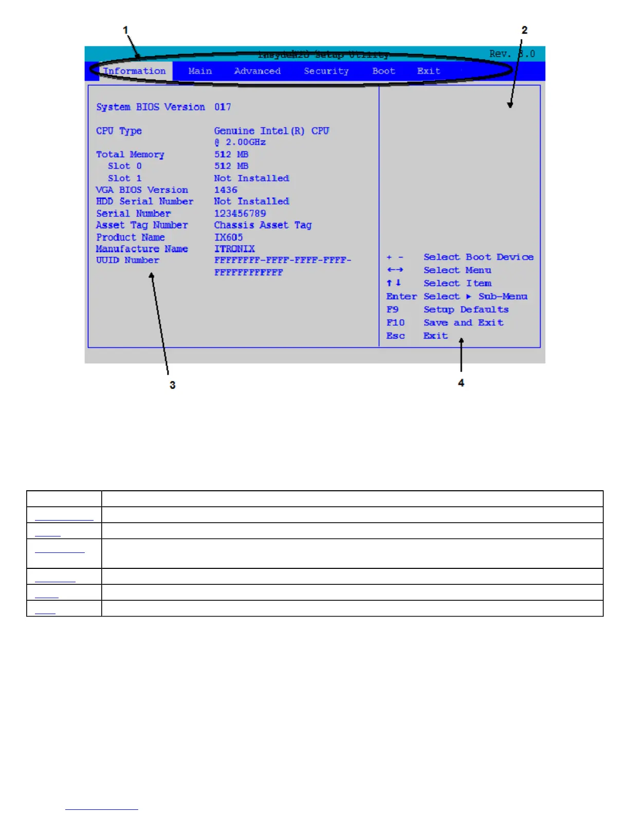 The Setup Utility has six menu options in the Menu Bar (1) at the top of the window. Press the left or right arrow