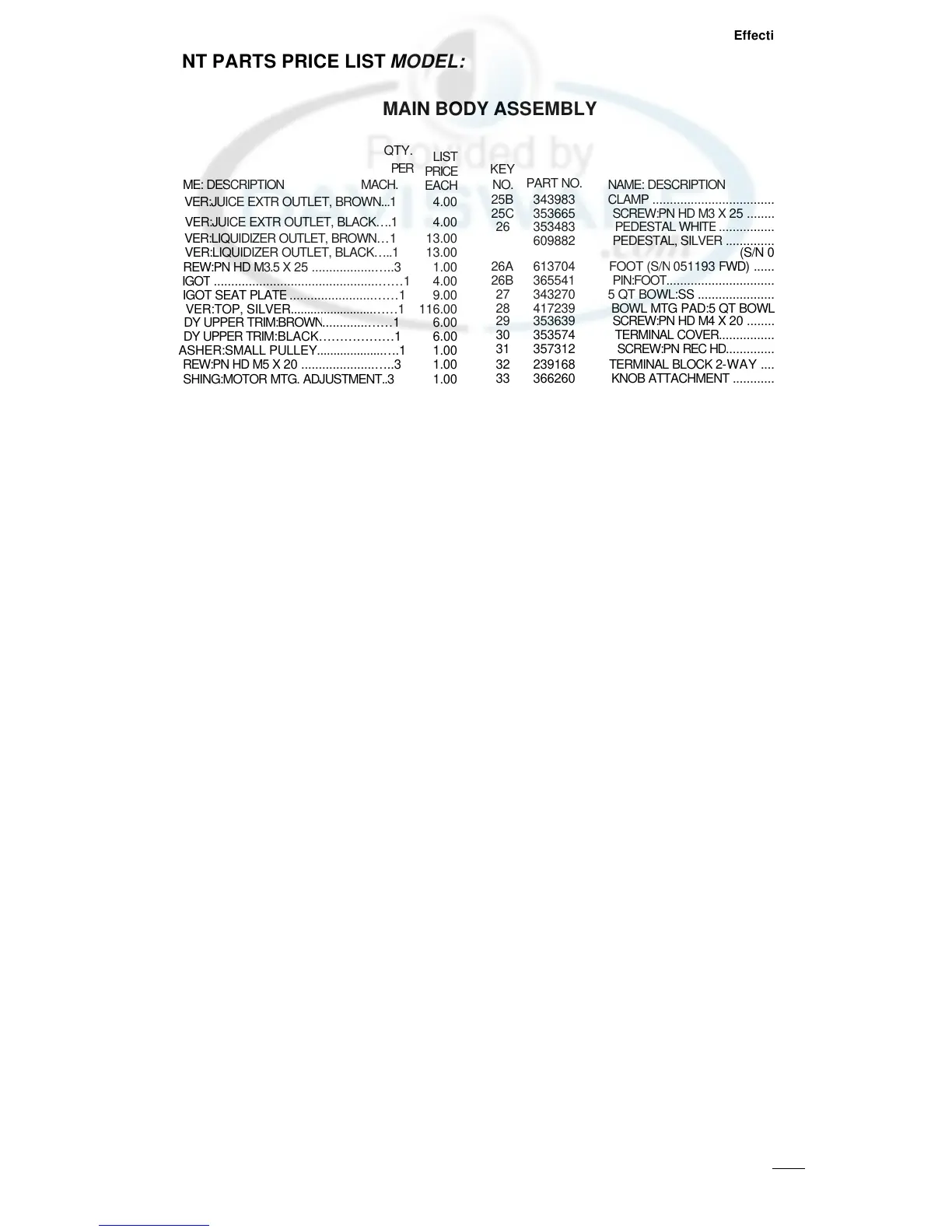 REPLACEMENT PARTS PRICE LIST MODEL: