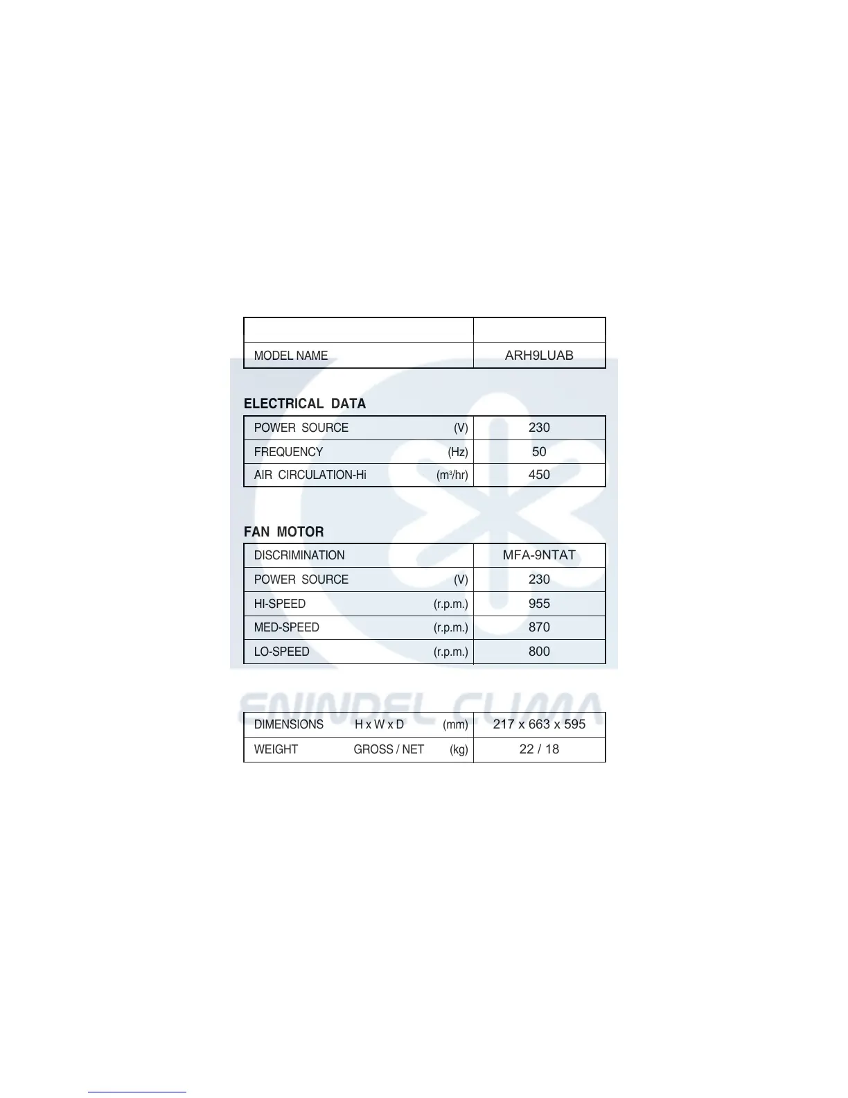 General ARH9LUAB - SPECIFICATIONS; INDOOR UNIT SPECIFICATIONS