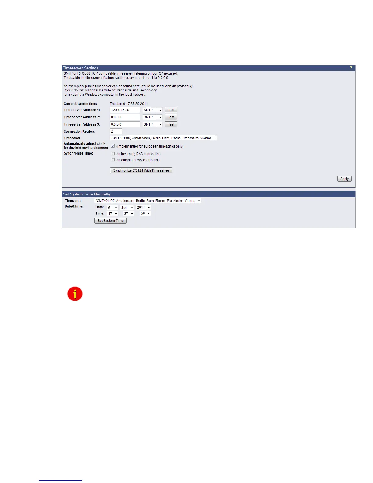 The CS121 firmware version 4.28.x provides the option to set the system time manually.